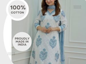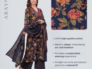 Arayna Women’s Pure Cotton Block Printed Kurta Set with Palazzo Pants & Dupatta – Ethnic Wear