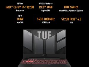 ASUS TUF Gaming F15 13th Gen, Intel Core i7-13620H Gaming Laptop(NVIDIA RTX 4050-6GB/140W RGP/16GB RAM/512GB SSD/FHD/15.6″/144Hz/RGB KB/90WHr/Windows 11/Office 2021/Mecha Gray/2.20 Kg) FX507VU-LP210WS