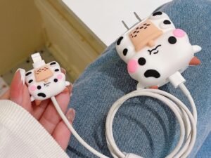 CASENED Protective Case for Apple 20W iPhone USB-C Power Adapter Charger and USB Lightning Cable|3D Cartoon Saver Accessory Case for iPhone Charger(Milk Tea Cow),White