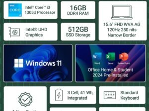 Dell Vostro, Intel Core i3 13th Gen – 1305U, 16GB DDR4 RAM, 512GB, FHD 15.6″/39.6 cm, Windows 11, Office H&S 2024, Carbon Grey, 1.66Kg, 120Hz 250 nits Narrow Border Display, Intel UHD Graphics Laptop