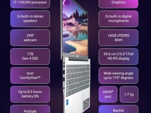 Acer Aspire Lite, 13th Gen, Intel Core i7-13620H Processor, 16 GB RAM, 1TB SSD, Full HD IPS, 15.6″/39.62 cm, Windows 11 Home,MS Office Pure Silver, 1.70 kg, AL15-52H, Backlit kB,Thin and Light Laptop