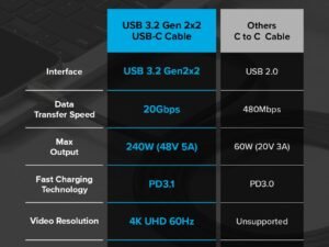Ringke USB 3.2 Gen 2×2 USB-C Compatible with Type-C [1M / 240W] Interfaces 20Gbps Data Transfer Speed Fast Charging Cable – 1m For Smartphone (Black)