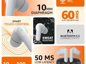 amazon basics True Wireless in-Ear Earbuds with Mic, Low-Latency Gaming Mode, Touch Control, IPX5 Water-Resistance, Bluetooth 5.3, Up to 60 Hours Play Time, Voice Assistance and Fast Charging (White)