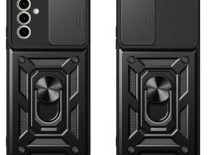 SkyTree Samsung Galaxy S24 5G, Robotic Sliding Camera Window Shock Proof Thunder Case, Dual Layer Hybrid Armor Back Cover Case with Kickstand for Samsung Galaxy S24 5G – Black