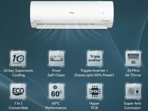Haier 1.5 Ton 5 Star Triple Inverter Split AC (4850 W, Copper, 7 in 1 Convertible, 4-Way Swing, Frost Self Clean, HD Filter, Cools at 60°C, 20 Mtr. Air Throw – HSU18K-PYSS5BN-INV, White)