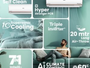 Haier 1.5 Ton 5 Star HEXA Inverter Split AC (5460W, Copper, Heavy Duty, 4 way Swing, Frost Self Clean, 7 in 1, HD Filter, Cools at 60°C, 20 mtr Air Throw – HSU19K-PYSC5BN-INV, White)