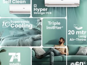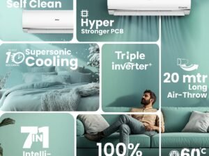 Haier 1.5 Ton 3 Star Triple Inverter Smart Split AC (5125 Watts, Copper, Wi-Fi, 4-Way Swing, 7 in 1 Convertible, Frost Self Clean, HD Filter, Cools at 60°C – HSU18K-PYFR3BN-INV, White)