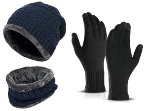 TRUFLAIR Winter Knit Beanie Cap Hat Neck Warmer Scarf and Woolen Gloves Set Skull Cap for Men Women/Winter Cap for Men (3 Piece) Blue