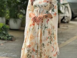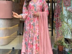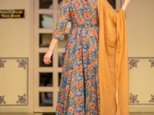 GoSriKi Women’s Rayon Blend Printed Anarkali Kurta with Pant & Dupatta