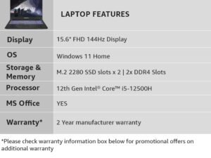 GIGABYTE G5 GE-51IN213SH with 15.6″ FHD 144Hz, Intel 12th Gen i5-12500H,Nvidia RTX 3050 4G Gaming Laptop (8GB DDR4 Memory/Windows 11 Home/64bit + Office 365 / Gen4 512 GB SSD Black)