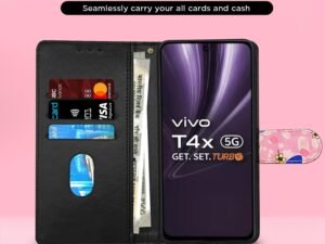 Pikkme Flip Cover for Vivo T4 5G / iQoo Z10 5G Leather Finish | Inside TPU with Card Pockets | Wallet Stand and Shock Proof | Complete Protection Flip Case(Black)