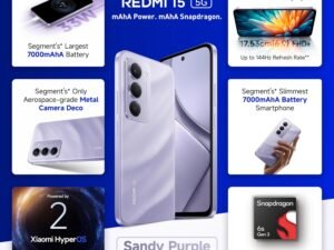 Redmi 15 5G Sandy Purple 6GB + 128GB | Segment’s Largest 7000mAhA Battery | Segment’s Largest Display 17.53cm(6.9) Up to 144Hz | Snapdragon 6s Gen 3 | 18W Reverse Charging | 50MP AI Dual Camera