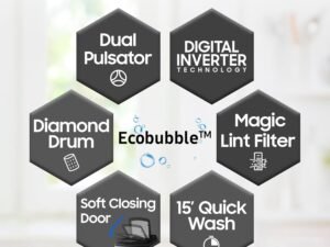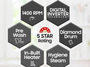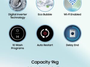 Samsung 9 kg, 5 star, AI EcoBubble, Super Speed, Wi-Fi, Hygiene Steam with Inbuilt Heater, Digital Inverter, Fully-Automatic Front Load Washing Machine (WW90DG5U24AXTL, Inox)