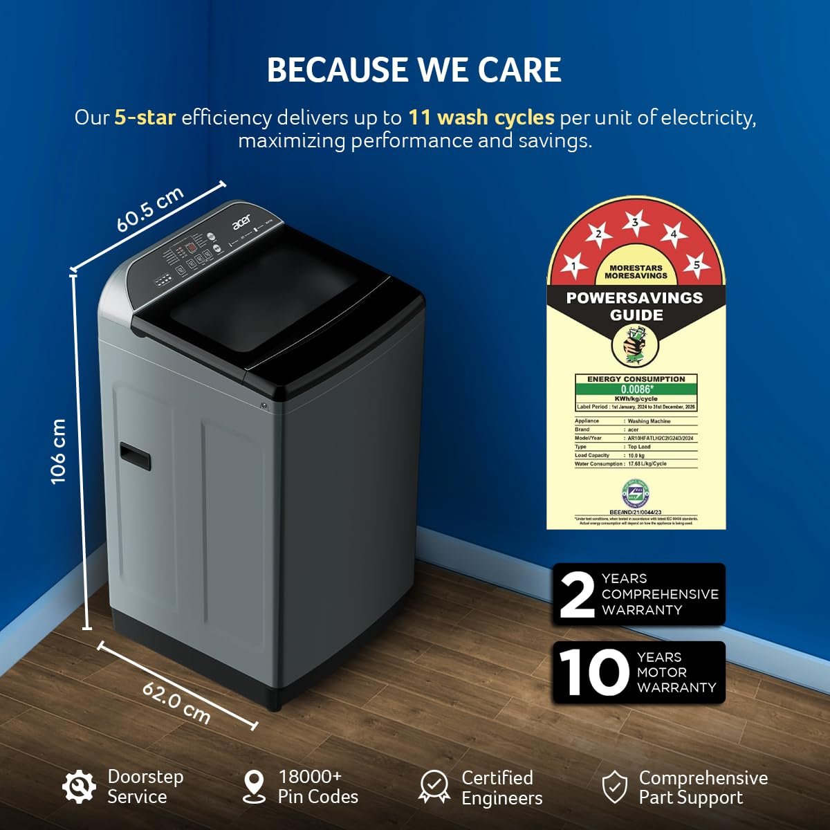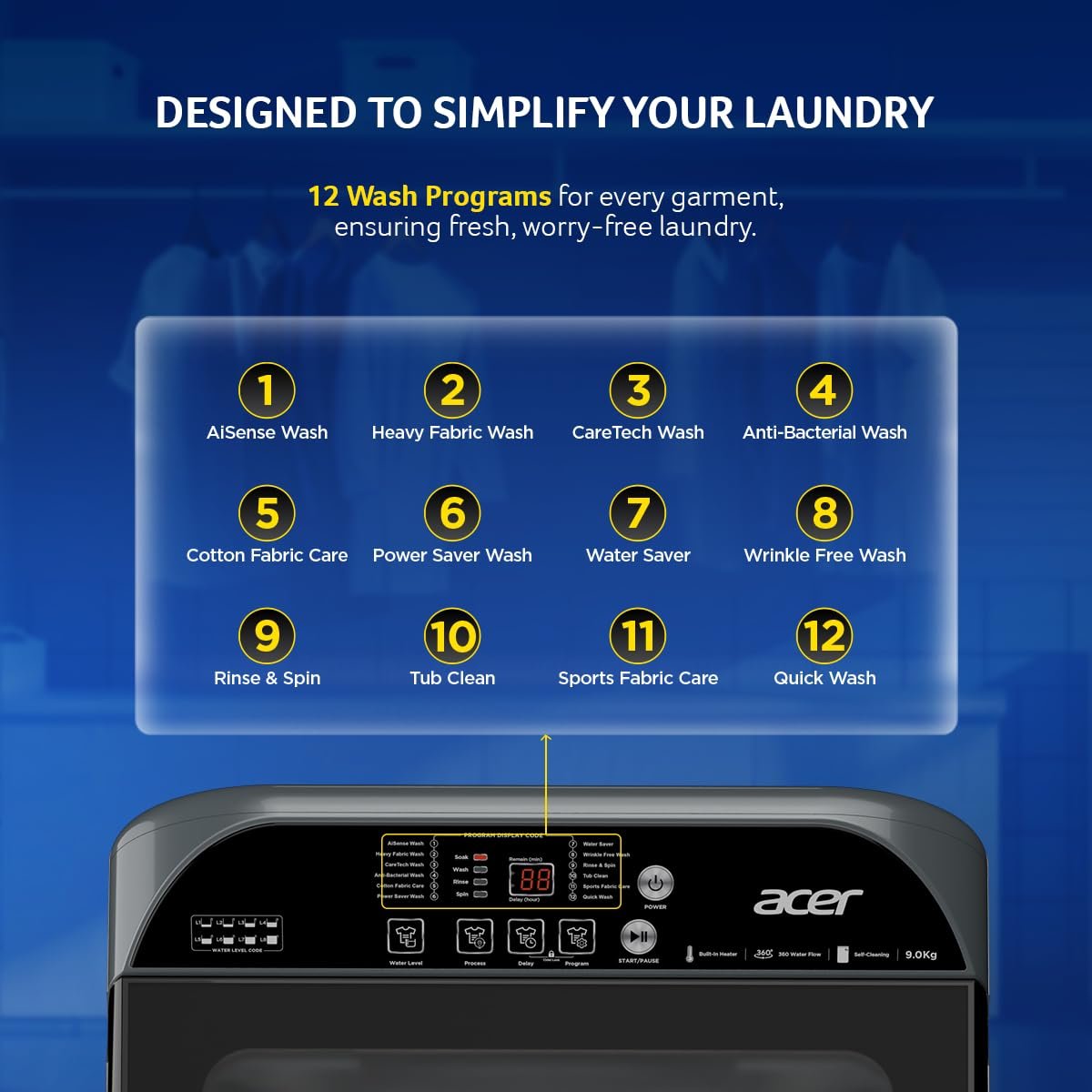 Acer 9.0 Kg 5 Star Fully-Automatic Top Loading Washing Machine (AR90HFATLH2C2IG24D, Inox Grey,12 Wash Programs, In-Built Heater, Magic Filter, Robust Motor)