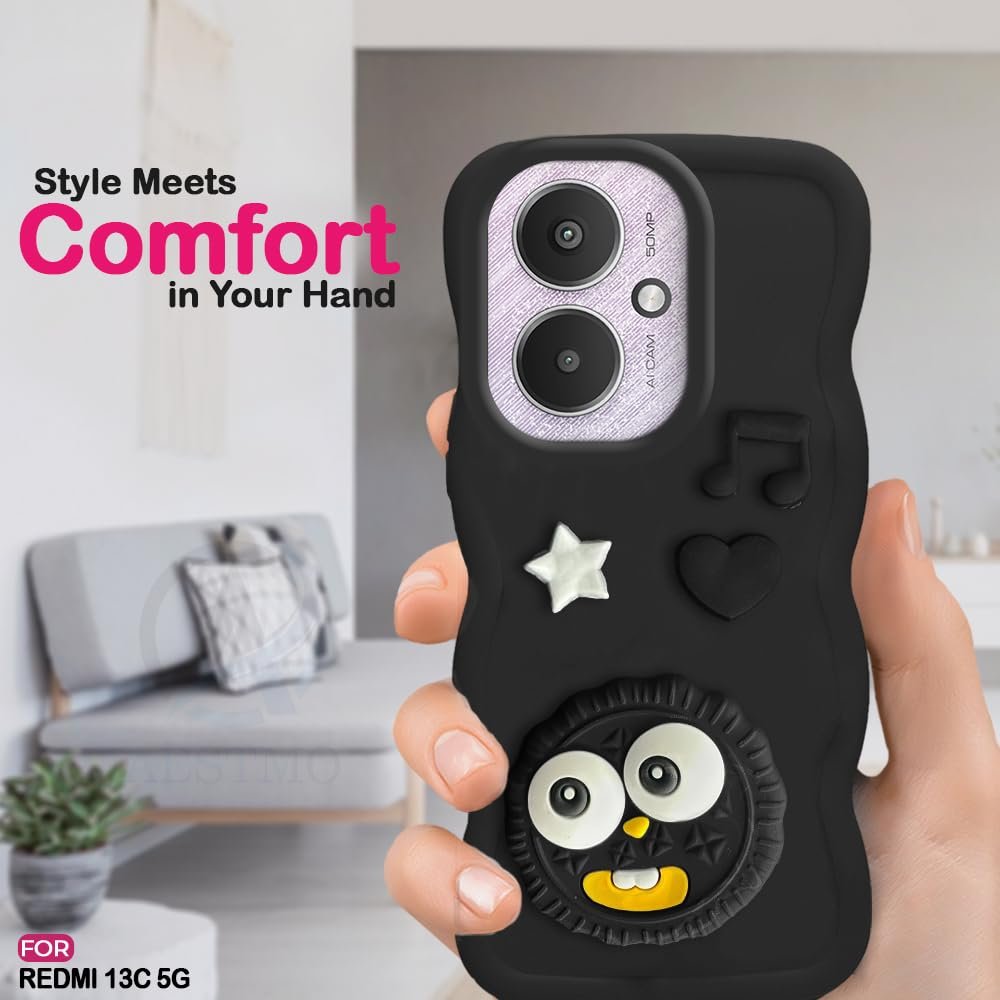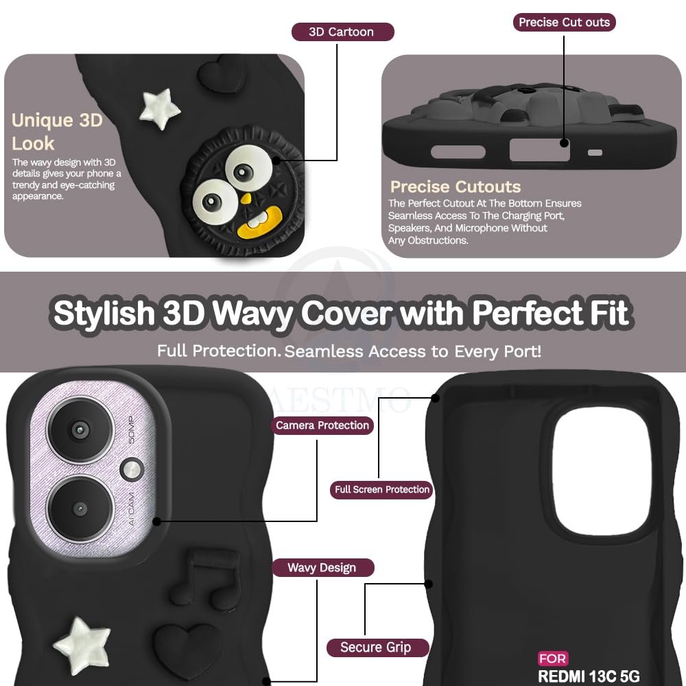 AESTMO Back Case Cover for Redmi 13C 5G / Poco M6 5G | 3D Cute Fun Cartoon Characters | Anti Slip Grip Cute Wave Curly Frame Shape | Back Cover for Redmi 13C 5G / Poco M6 5G | (Black)