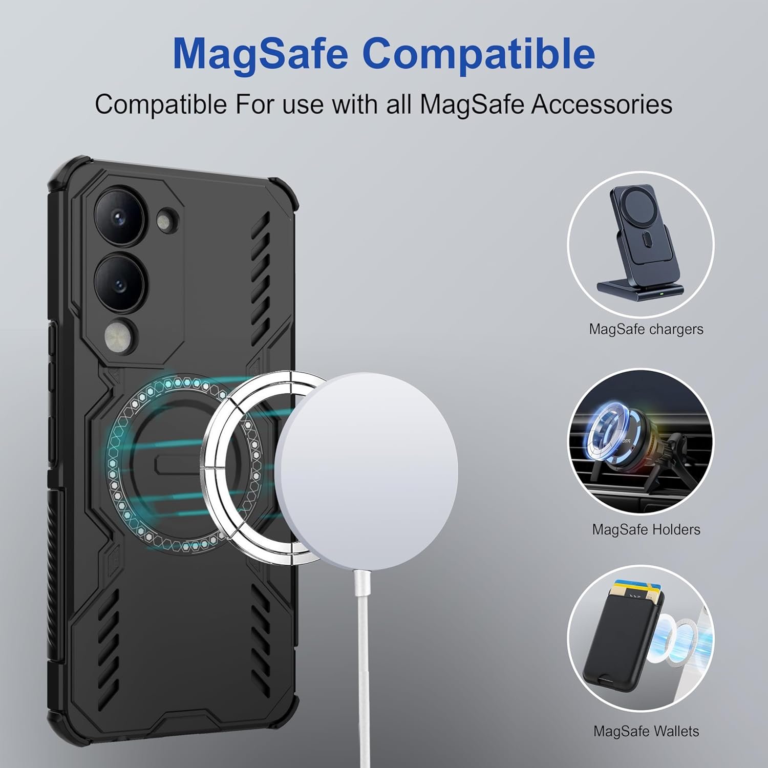 [Design]: Built-in strong circular MagSafe makes the case fully compatible with MagSafe chargers, holders, wallets, and other MagSafe accessories for fast and secure attachment.