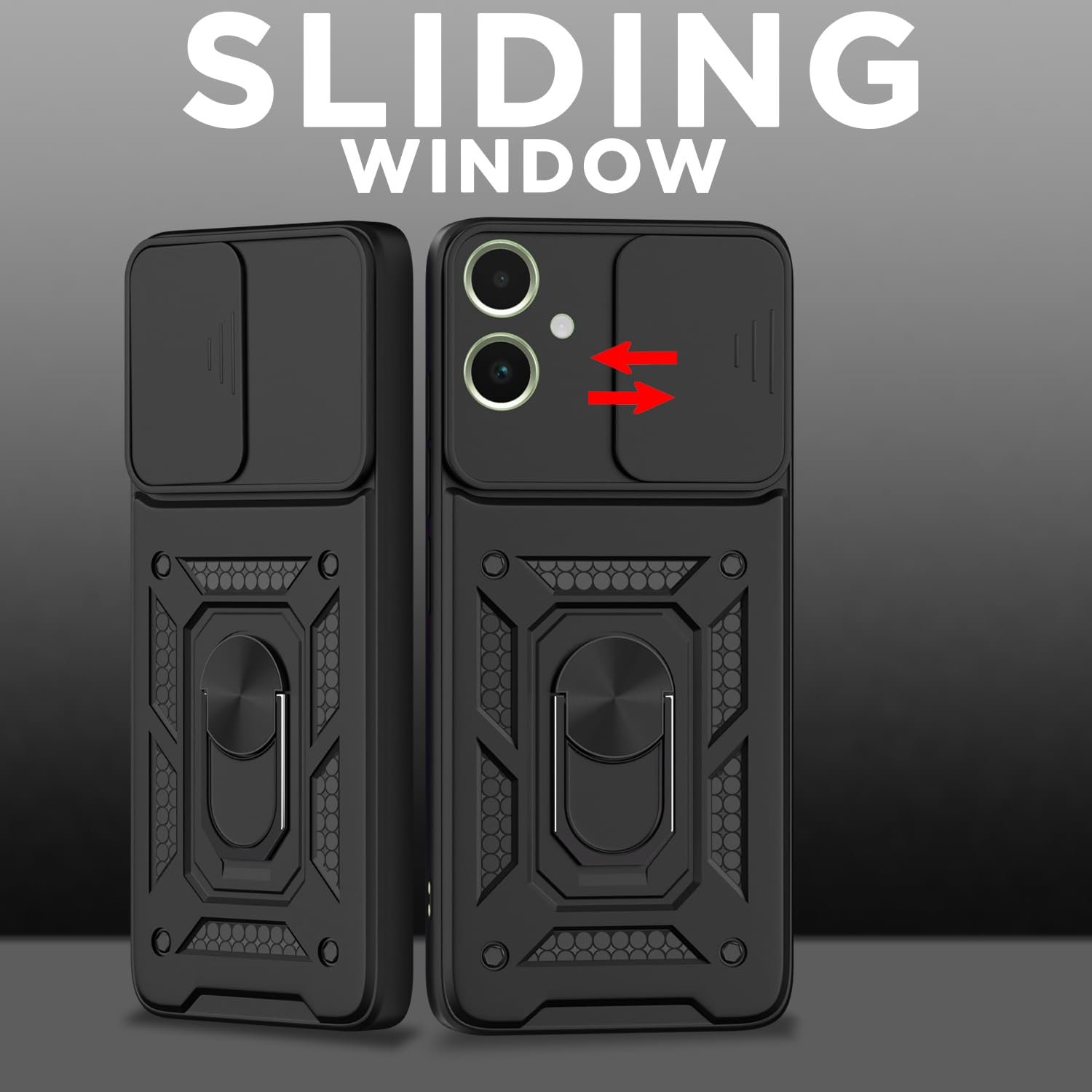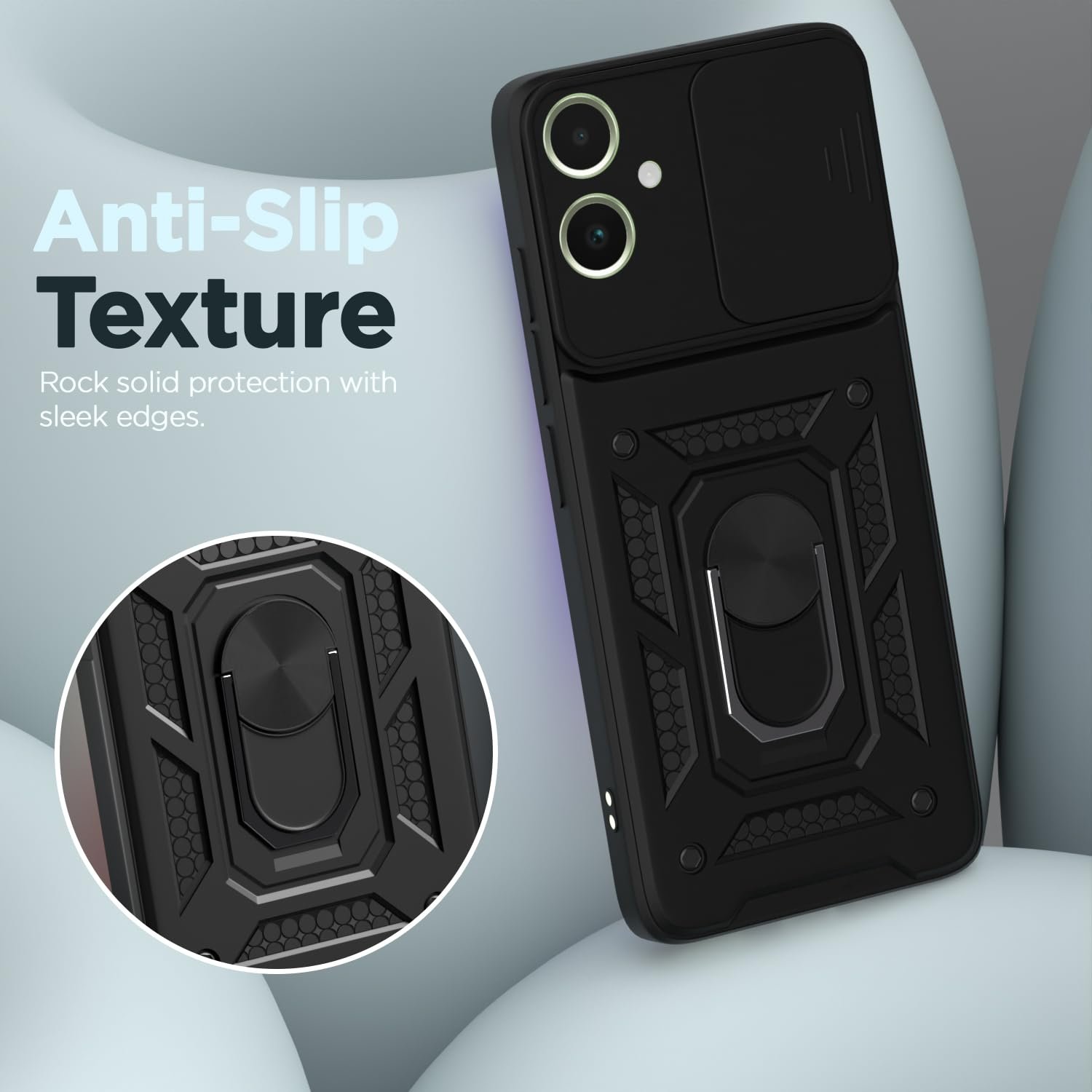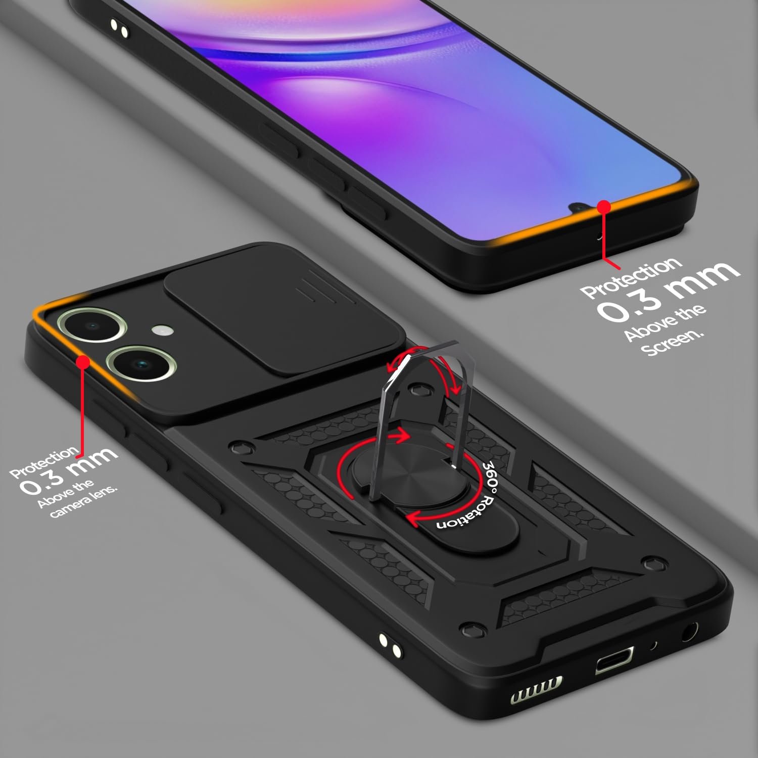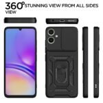 Amazon basics Back Cover for Samsung Galaxy F05 / A05 / M05|360 Protection Case|Sliding Camera Sheild Cover & Ring Holder Stand Back Cover|D10 Tough Armor Bumper Case (Black)