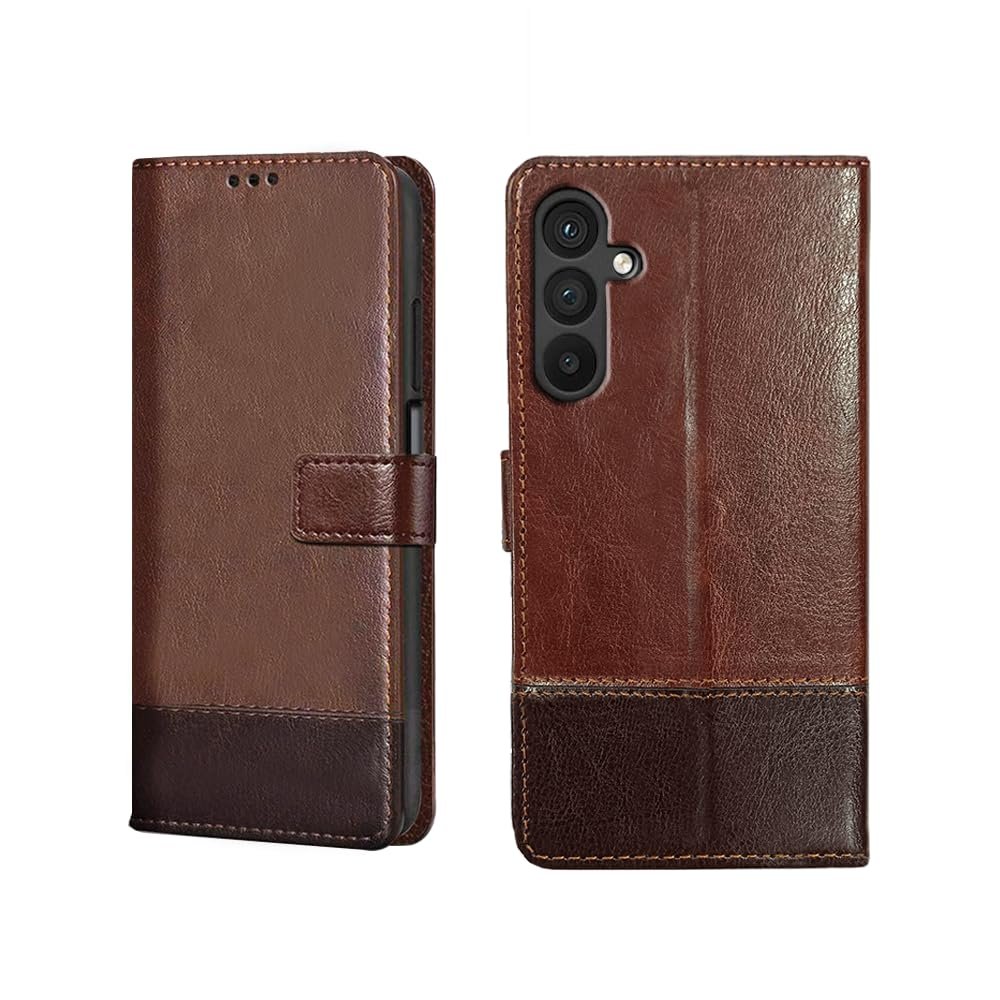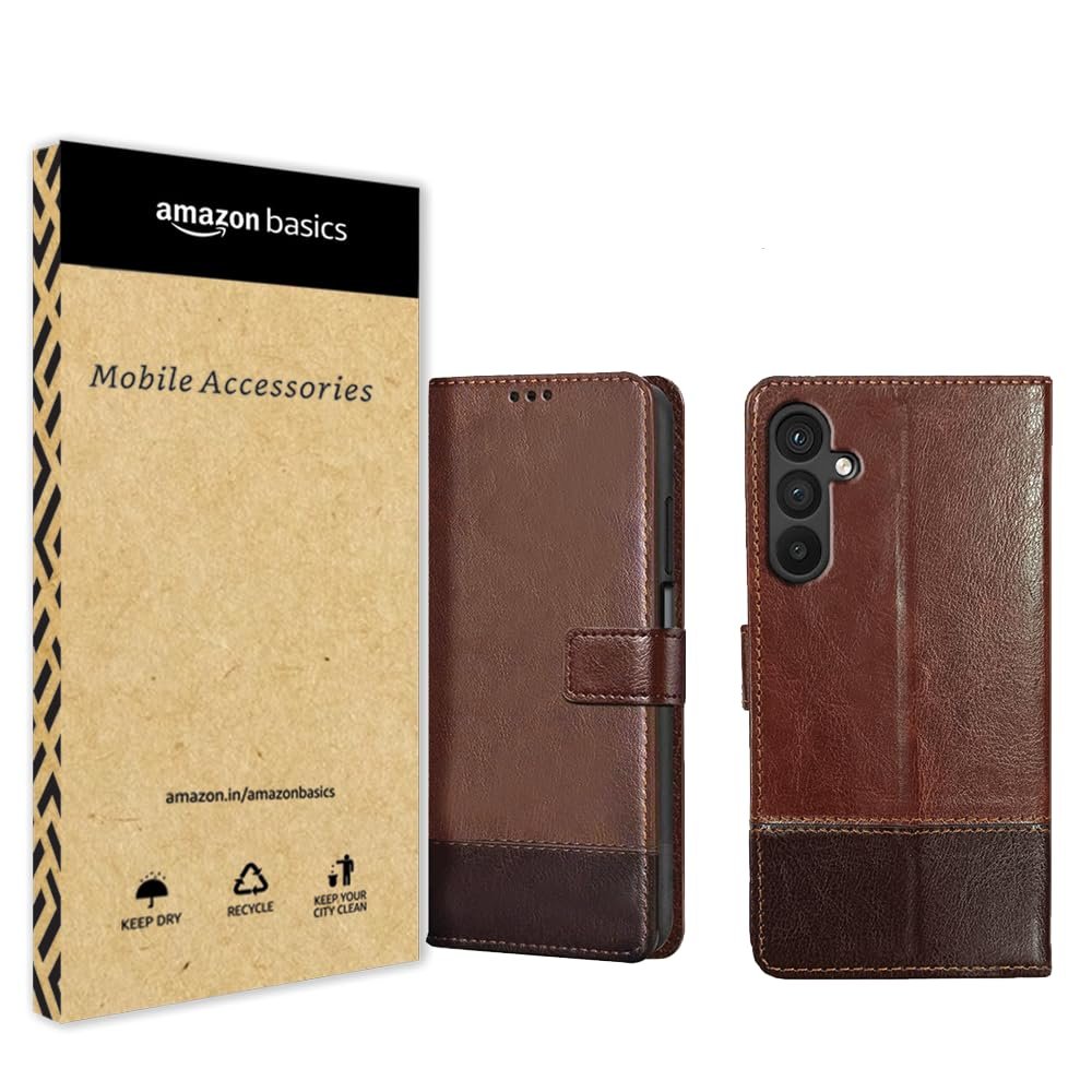 Amazon Basics Flip Back Cover Case for Samsung Galaxy M35 5G | Dual-Color Leather Finish | Inbuilt Stand & Pockets | Wallet Style Flip Back Case Cover for Samsung M35 5G (Faux Leather, Brown & Coffee)