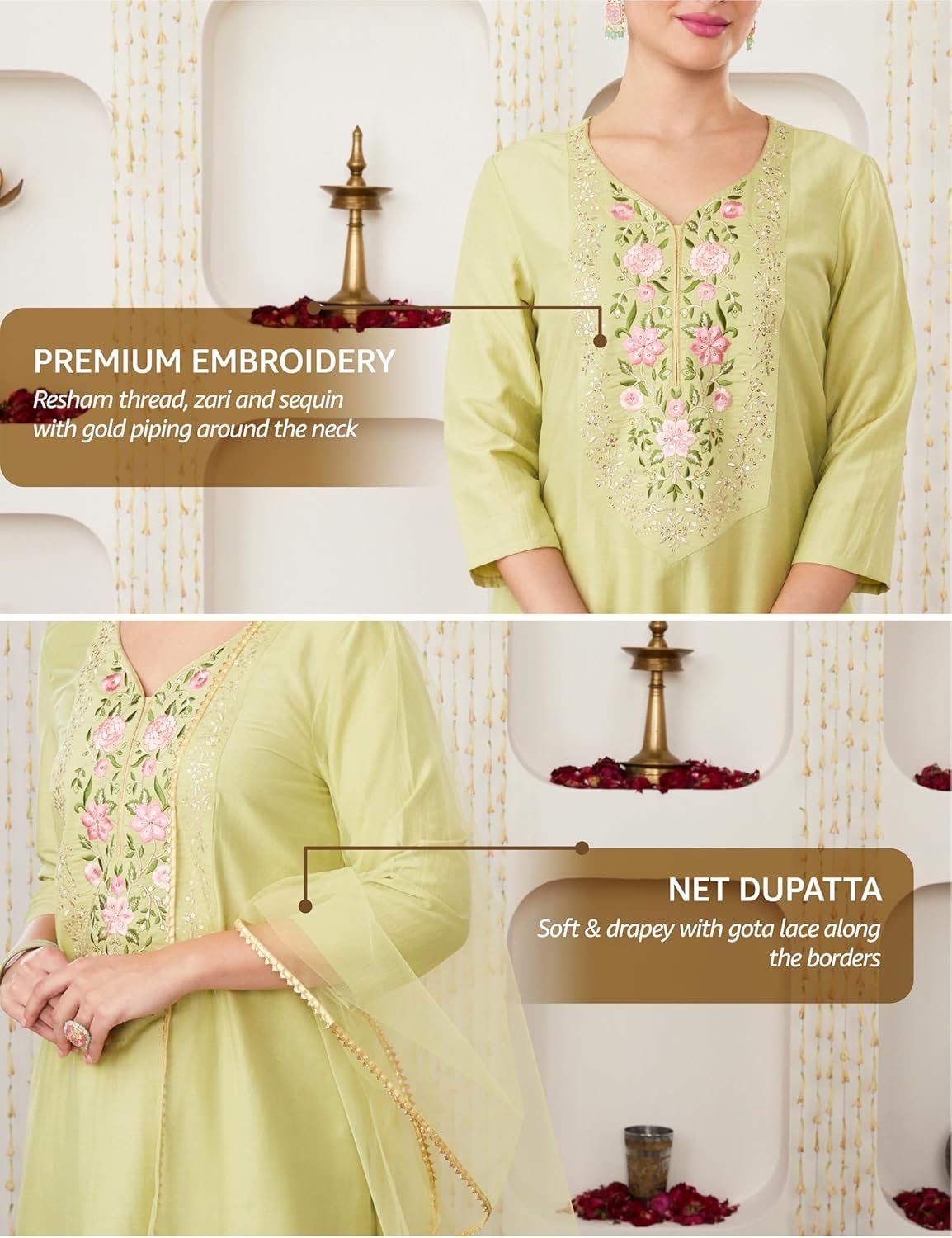 Amazon Brand – Myx presents an exquisitely curated festive collection that celebrates opulent elegance. These stunning 3-piece ensembles showcase kurtas with intricately embellished yokes, featuring a masterful blend of resham and zari embroidery enhanced with shimmering sequin details. Each set is beautifully complemented by ethereal net dupattas adorned with gold gota lace borders, creating a perfect harmony of traditional craftsmanship and contemporary sophistication. Whether paired with mojris or sleek heels, and adorned with statement earrings, these pieces transform every celebration into a memorable occasion with their refined glamour.