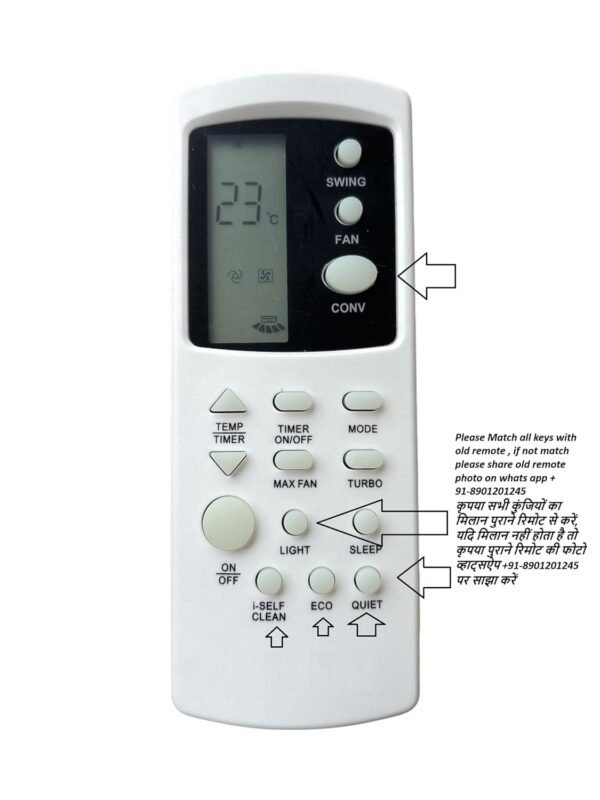 Our AC remote control is a handheld device used to wirelessly operate and adjust the settings of an air conditioning unit. It communicates with the indoor unit via infrared (IR) signals, allowing users to control the AC from a distance. Common Features & Buttons: Power Button Turns the air conditioner ON or OFF. Mode Button Switches between various modes like: Cool – for cooling the room Dry – for dehumidifying Fan – for air circulation Heat – for heating (in hot & cold models) Auto – automatically selects mode based on room temperature Temperature Control (+ / -) Adjusts the desired room temperature. Fan Speed Button Changes the fan speed (Low, Medium, High, Auto). Swing or Airflow Direction Adjusts the direction of air flow (vertical or horizontal swing). Timer Allows setting a specific time for the AC to turn ON or OFF automatically. Sleep Mode Gradually adjusts the temperature and fan speed for comfortable sleep | ⚠️ Compatibility Details- How to choose a correct remote for our air conditioner (ac) 1. We should have our old remote. 2. We have to match our old remote with new remote we wish to buy. Each and every button should be same then only buy. 3. We don’t need ac model number to buy a new remote. 4. The only requirement is old remote. 5.If we have old remote and unable to find exact match 6. Kindly share old remote picture on given number we will share you amazon link for correct product. 7. If we don’t have old remote then we have to message on whatsapp we will send you appropriate remote amazon link. 8. Don’t think yourself lets try this one / this one is looking good / I thought brand name is same so it will work. 9. Every ac and remote has sensor to pairing, no any other remote will work in your ac. 10. Kindly contact us on whatsapp for hassle free shopping.