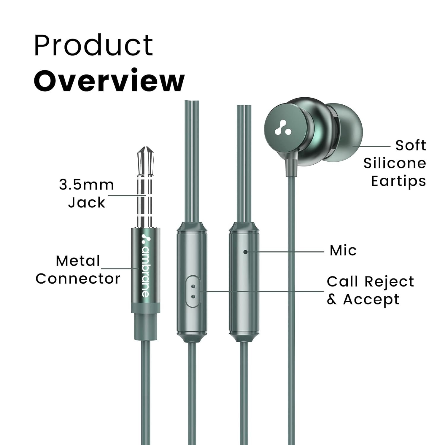 Ambrane Stringz 38 Wired Headphones with Mic, Powerful HD Sound with High Bass, Tangle Free Cable, Comfort in Ear Fit, 3.5mm Jack (Green), Normal