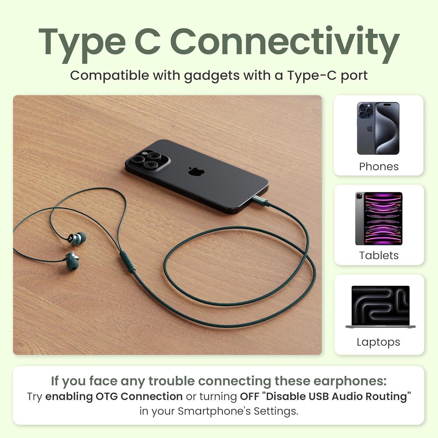 Earphones Connectivity Solution – Try enabling OTG Connection or turning OFF “Disable USB Audio Routing” in your Smartphone’s Settings.