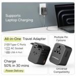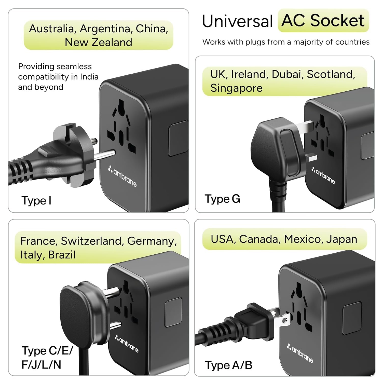 Ambrane Universal Travel Adapter Charger with 65W Laptop/MacBook Charging & Mobile Charging, Works Worldwide (EU,UK,USA,AUS,Others) AC Sockets, USB & Type C, International Adapter (ATA-02, Black)