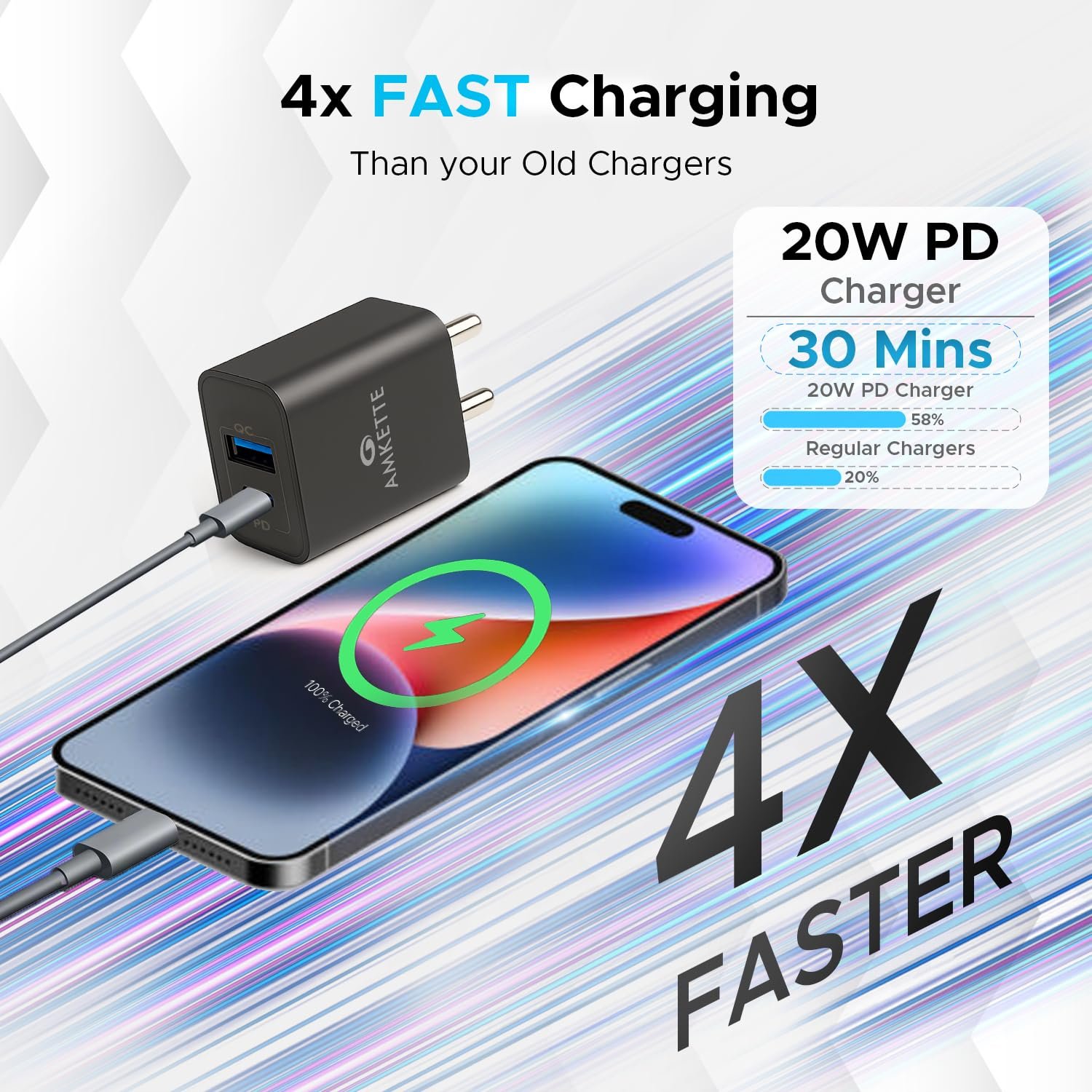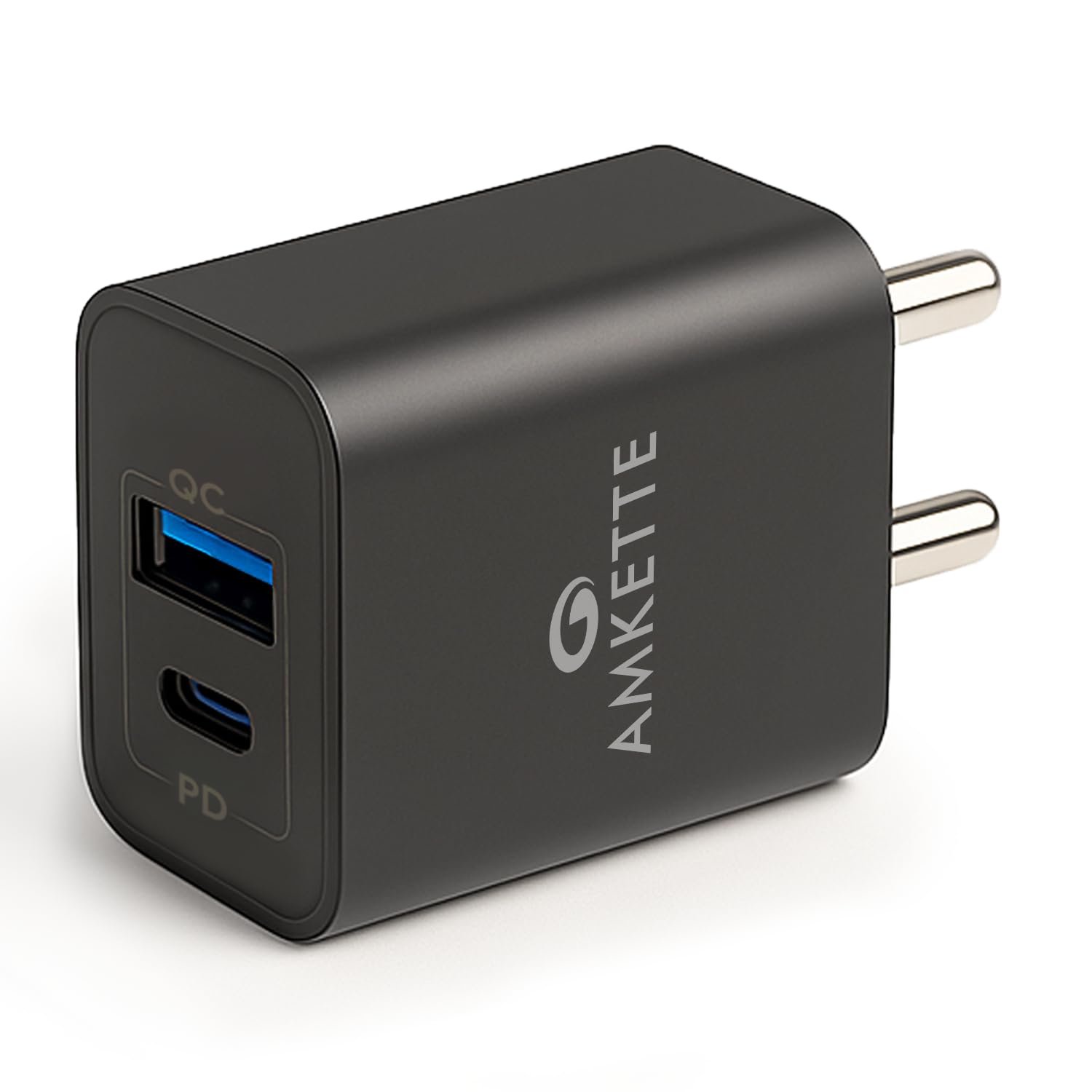 Amkette ChargePro 20W Universal Charger Adapter (BIS Certified) | Dual Port (USB A+Type C), PPS Fast Charger | Smart IC Protection | for All Devices & Brands- iPhone, Samsung, Google, Xiaomi & More