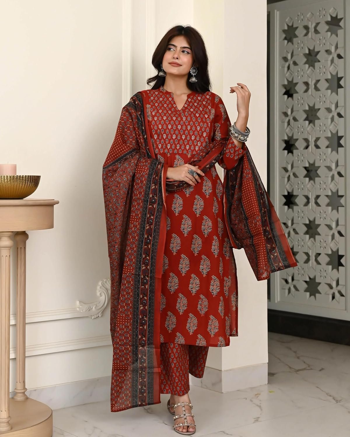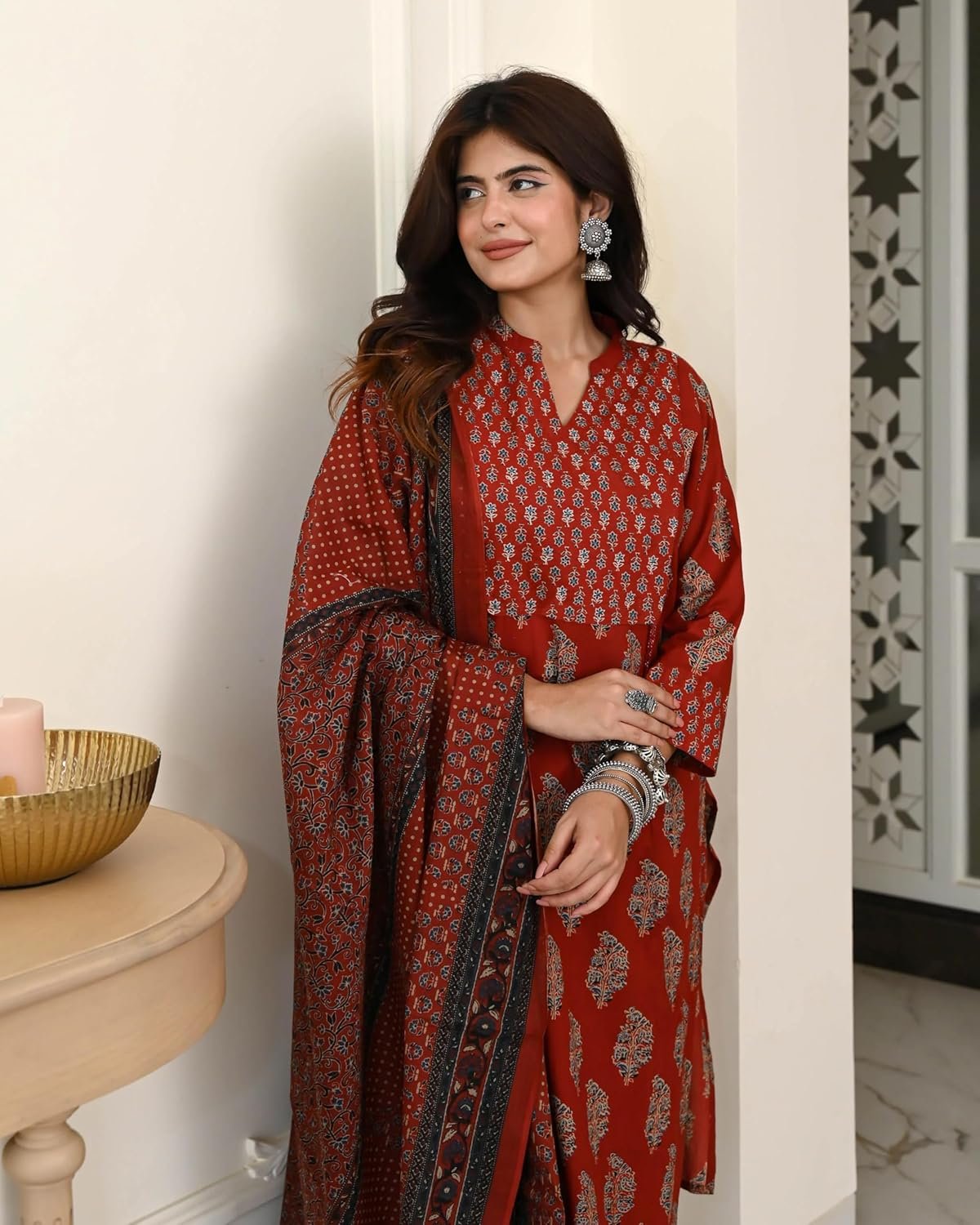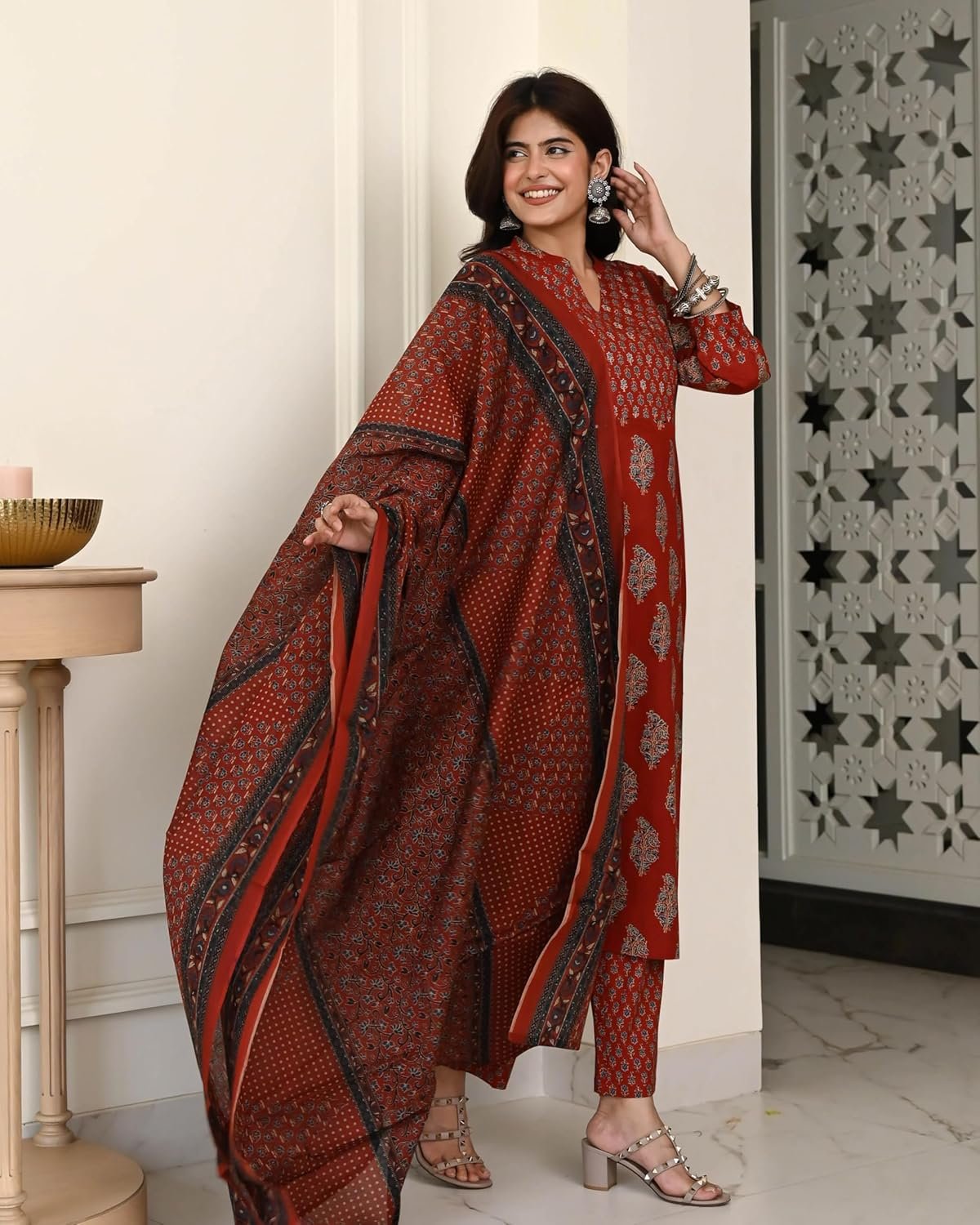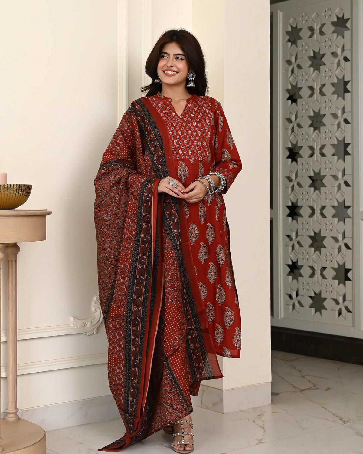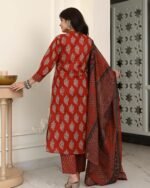 Elevate your ethnic wardrobe with Anni Designer Cotton Ajrakh Print Kurta Plazzo Set with Dupatta. Made from soft, breathable cotton, this outfit blends comfort and timeless style. The authentic Ajrakh print delivers a traditional charm, while the straight-cut kurta and matching plazzo ensure an elegant yet relaxed fit. Ideal as a cotton kurta set for women, kurti pant set with dupatta, or suit set for women cotton, it is perfect for festive occasions, office wear or casual gatherings. Durable stitching and colorfast fabric make it easy to maintain and a must-have addition to your everyday ethnic collection