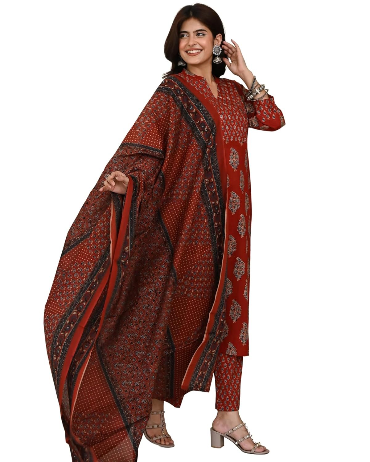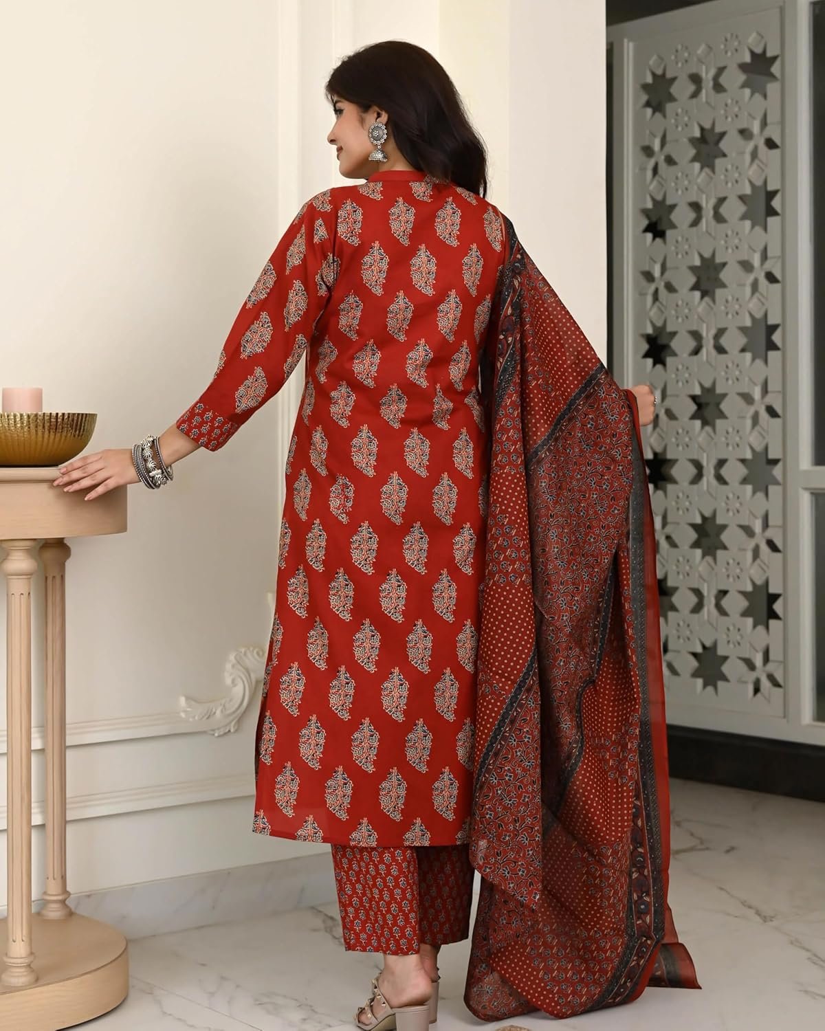 Anni Designer Cotton Ajrakh Print Kurta Plazzo Set with Dupatta | Kurti Set for Women | Suit Set for Women Cotton | Kurti Pant Set with Dupatta Festive Kurta Set