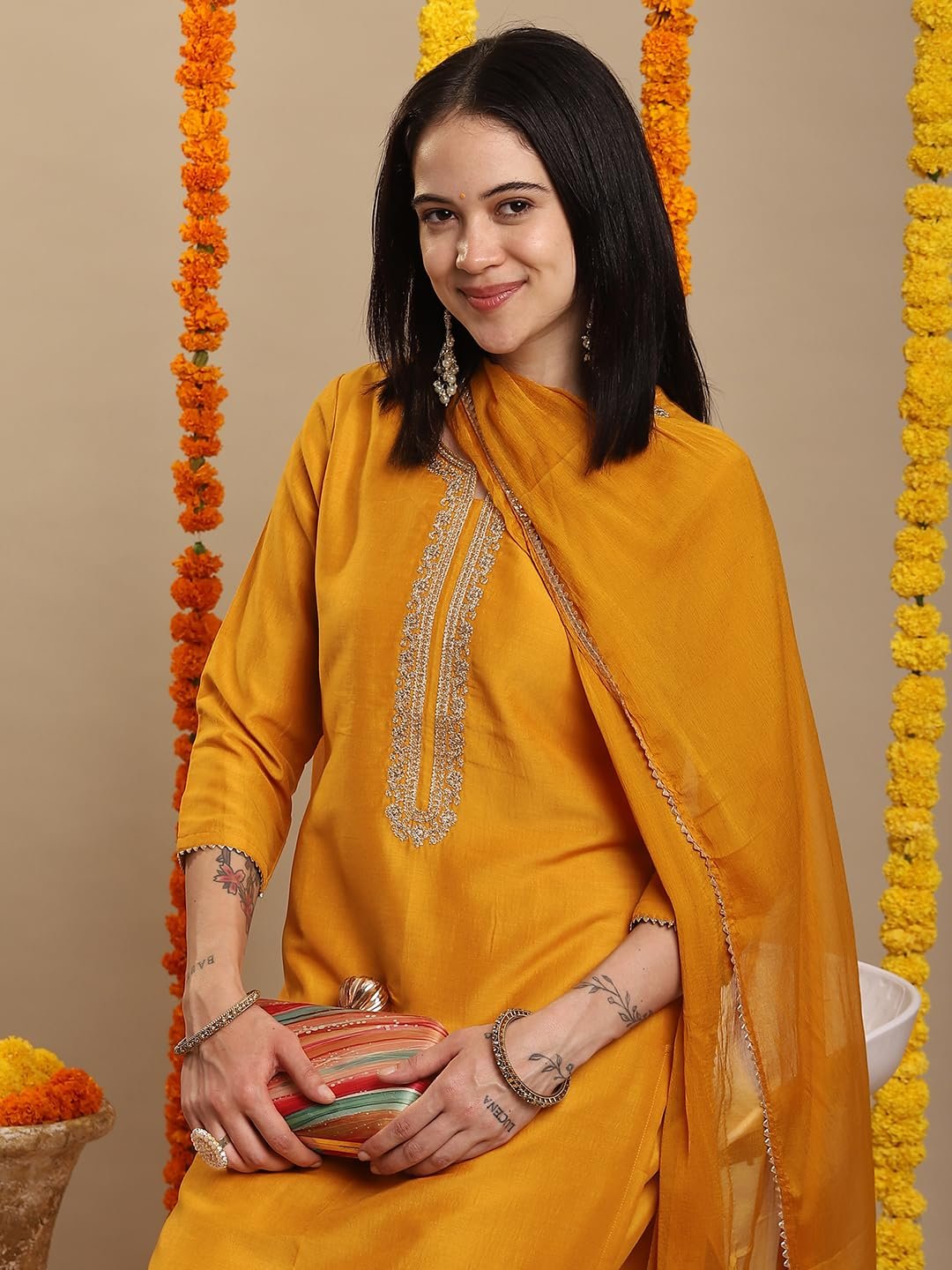 ANNI DESIGNER Women’s Rayon Blend Straight Embroidered Kurta with Pant & Dupatta
