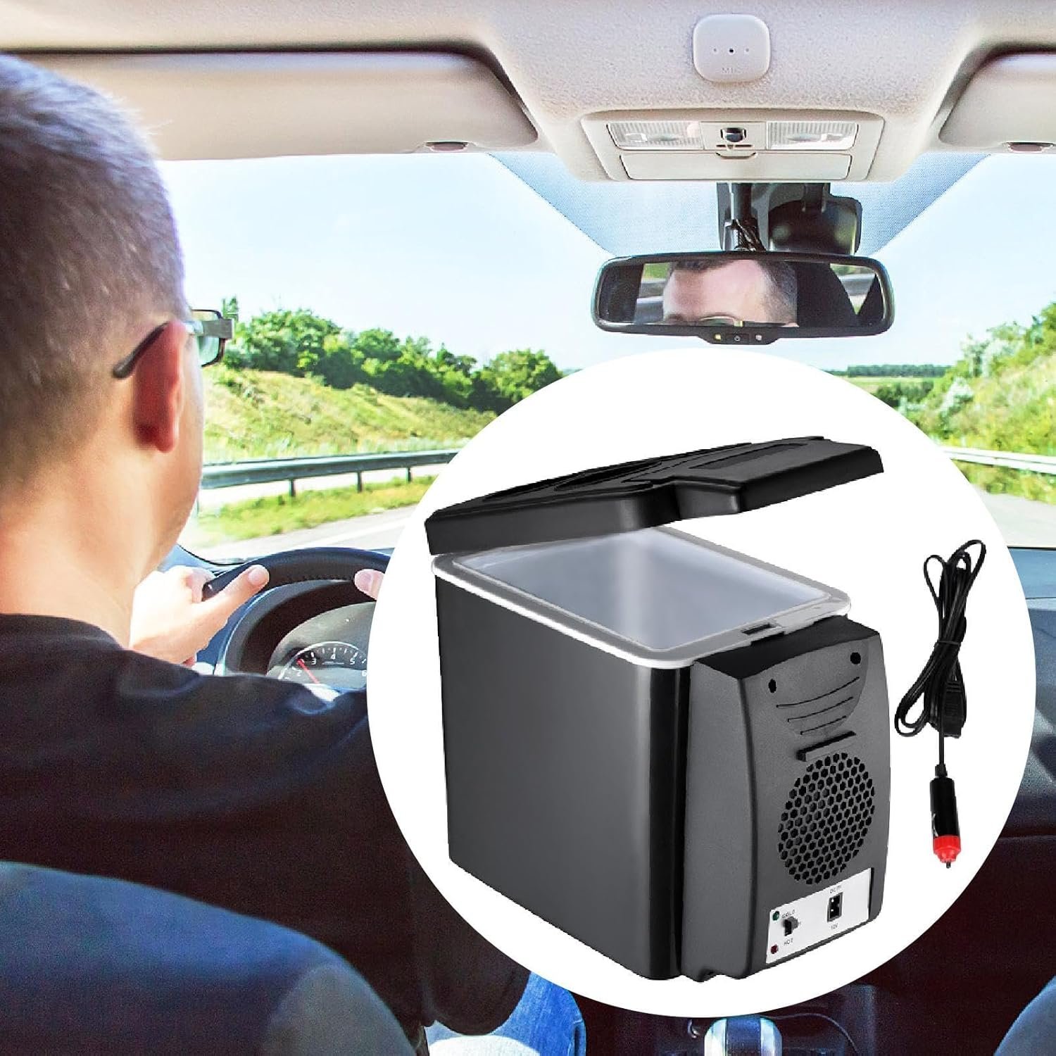 Convenient Accessibility and Space Saving : Designed for easy access while driving or during outdoor activities, this portable fridge cooler can hold up to six can of water, making it ideal for picnics or road trips