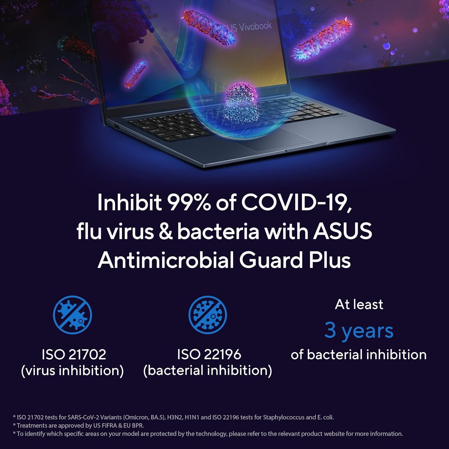 ASUS Antimicrobial Guard Plus is applied to frequently touched areas of your laptop to help keep it hygienic. This technology uses a denser treatment* that inhibits viruses and bacteria. And it is scientifically shown — using the ISO 2170211 and 2219612 standards — to inhibit virus and bacteria growth by more than 99% over a 24-hour period.