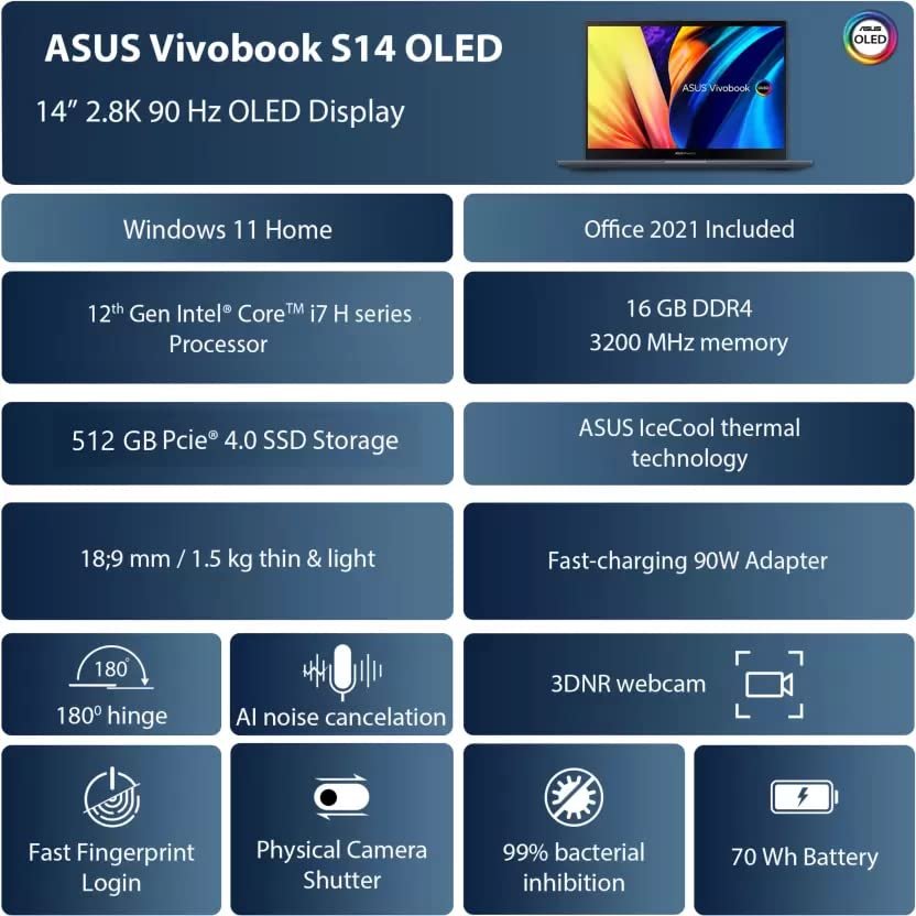 ASUS Vivobook S14 OLED (2022) Intel EVO Core i7 12th Gen – (16 GB/512 GB SSD/Windows 11 Home) S3402ZA-KM702WS Thin and Light Laptop (14 inch, Indie Black, 1.50 kg, with MS Office)