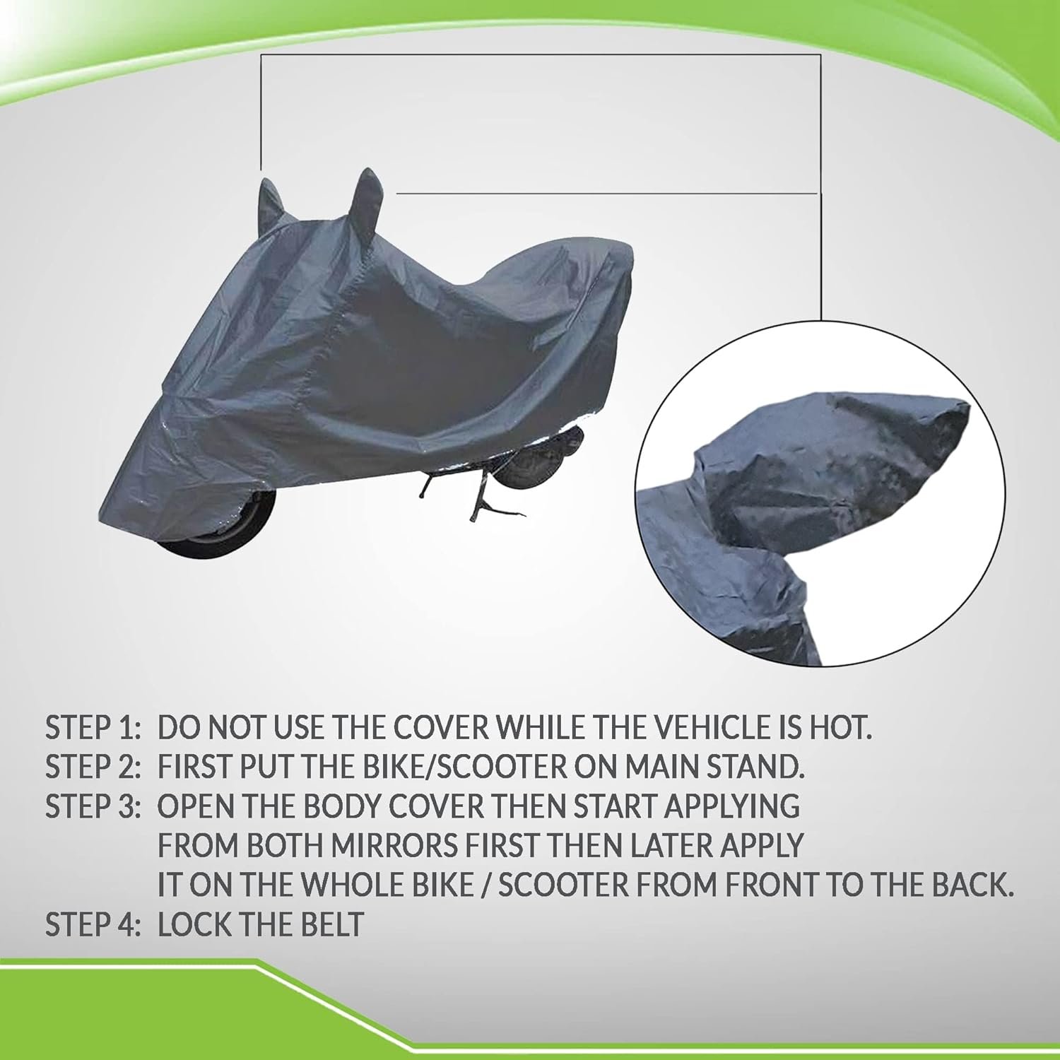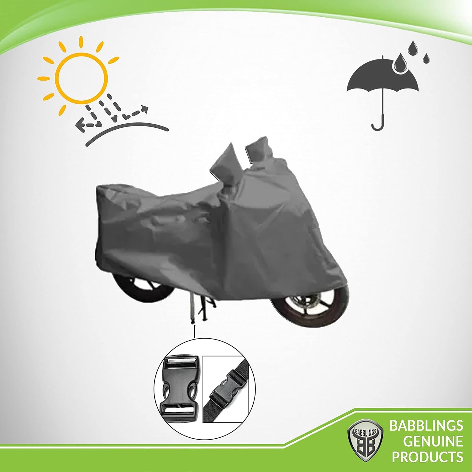 BABBLINGS Bike / Scooty body cover Water Resistant. Strong, effective, all weather Body Cover custom-fit Bike / Scooter Body Cover. Very tough and long lasting whilst being water and dust resistant. The cover is designed to protect your vehicle against harsh outdoor conditions. Our special Body Covers preserve the vehicle?s paint and safeguard it from dings, scratch, water and dust. The Body cover fits your vehicle with style and precision. Features: high fabric, water resistant, dust resistant, UV rays protection (uv rays cause paint fading). Light weight for ease of use and easily handled. Elegant Black color cover with front and rear holding elastics and center belt for proper and perfect fitting. BABBLINGS makes premium and top notch auto adornments including vehicle body spreads like Bike Body Cover with similarly great foundation guaranteeing top of the line generation of auto frill and items, BABBLINGS has been keeping up worldwide gauges and getting acknowledgment and love from cognizant customers the nation over.
