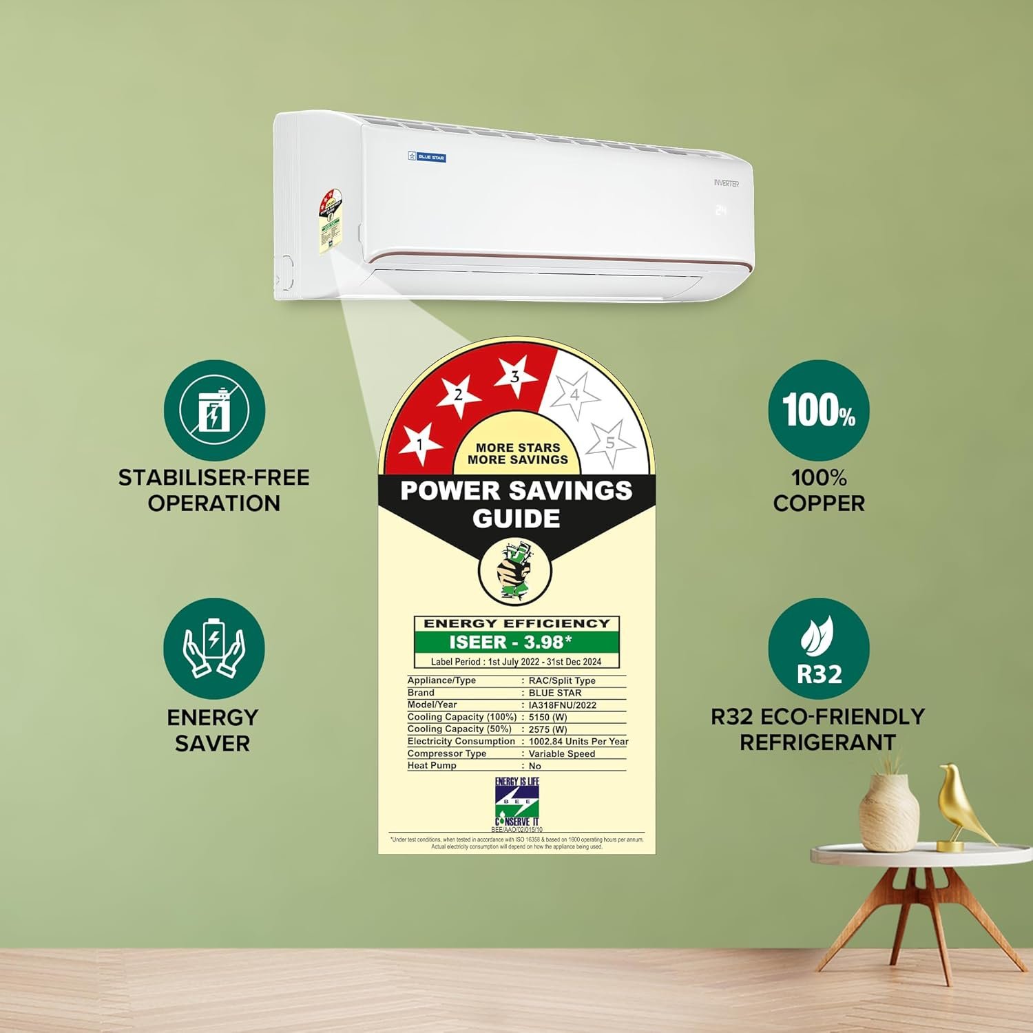 Energy Rating: 3 Star. Annual Energy Consumption: 1002.84 units. ISEER Value: 3.98 | The star rating is as per new BEE guidelines effective from 1st July 2022.