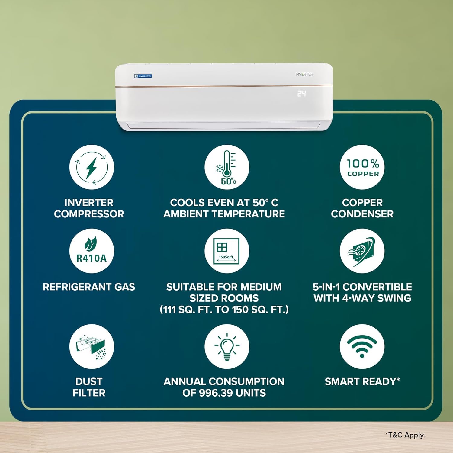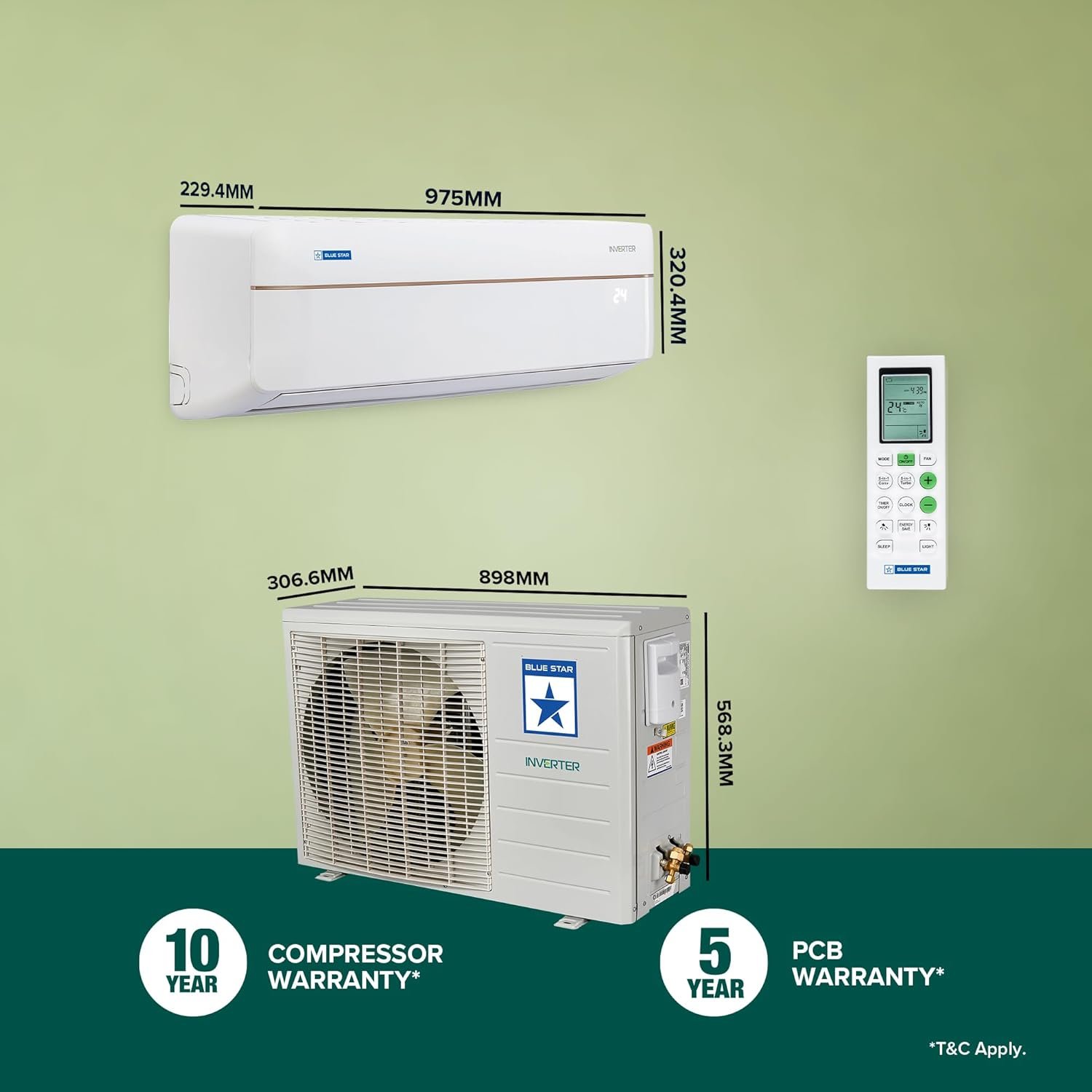 Blue Star 1.5 Ton 3 Star Hot and Cold, 60 Months Warranty, Inverter Split AC (Copper, Convertible 5 in 1 Cooling, Multi Sensors, Dust Filter, IC318VCUHC, White)