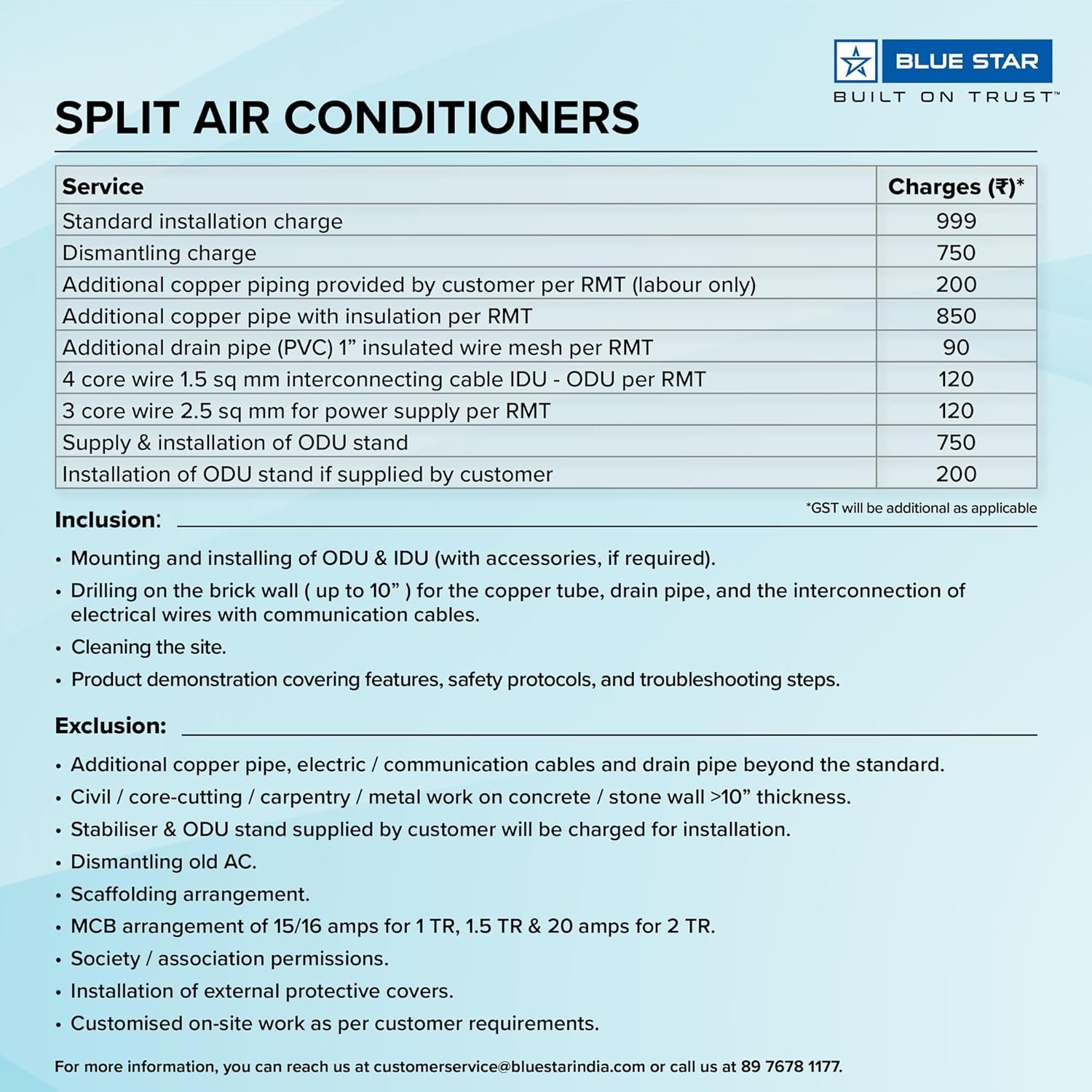 Manufacturer Warranty: 5 Years on Product, 10 Years on Inverter Compressor(T&C*).Covers-comprehensively all repairs, rectification, or replacement of Components like Electronic PCB, IDU Evaporating Coil & ODU Condenser Coil. Excludes all types of air filters, plastic and metal parts, remote handset & gas charging.Gas charging associated with Compressor/Evaporator/Condenser coil to be paid by customer. This applies to residential usage only.