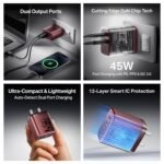 Auto-Detect Dual Output Ports – With one USB-A (30W QC 3.0) and one Type-C (45W PD, PPS) port, you can fast-charge two devices at once. Crafted for everyday use, the charger features smart auto-detect technology.