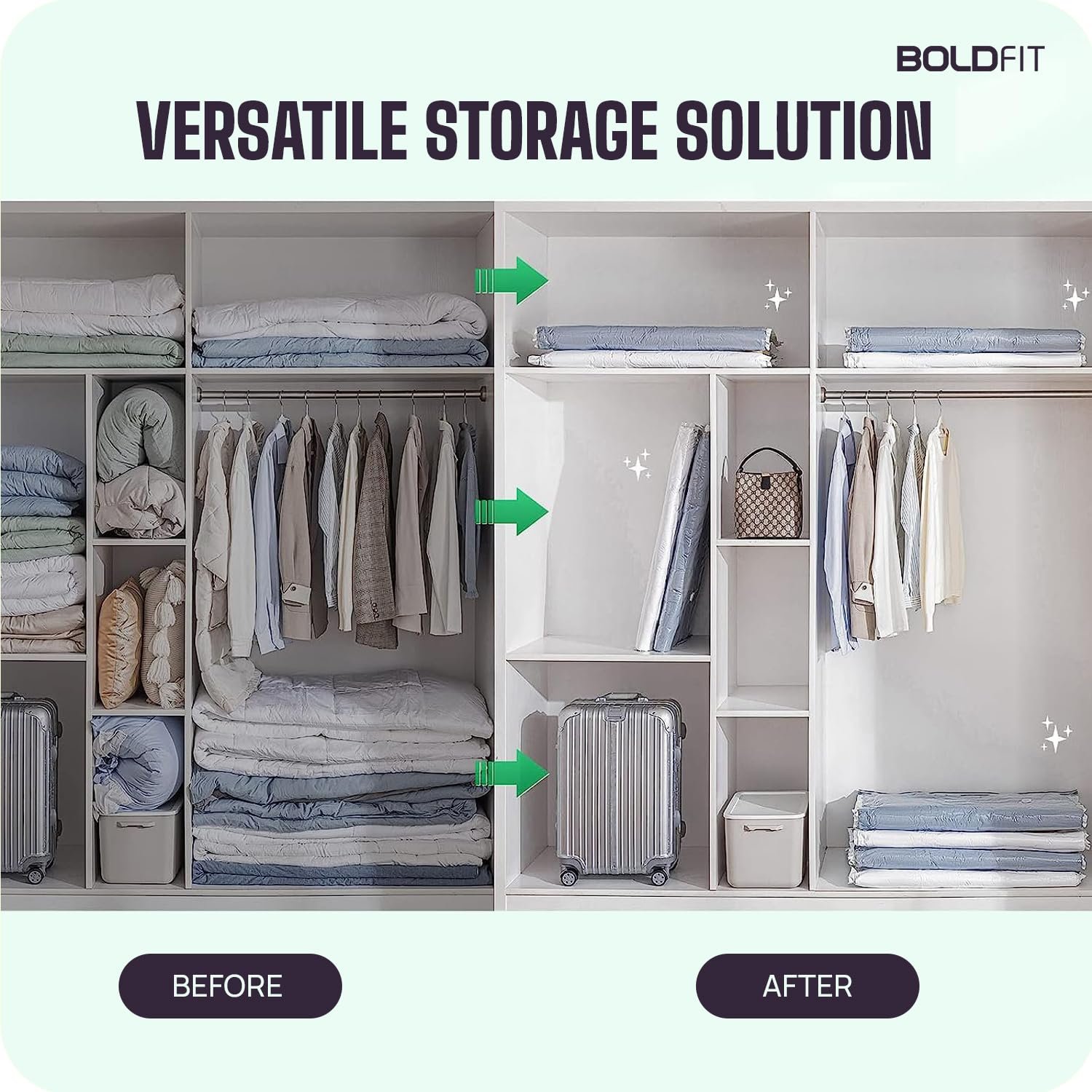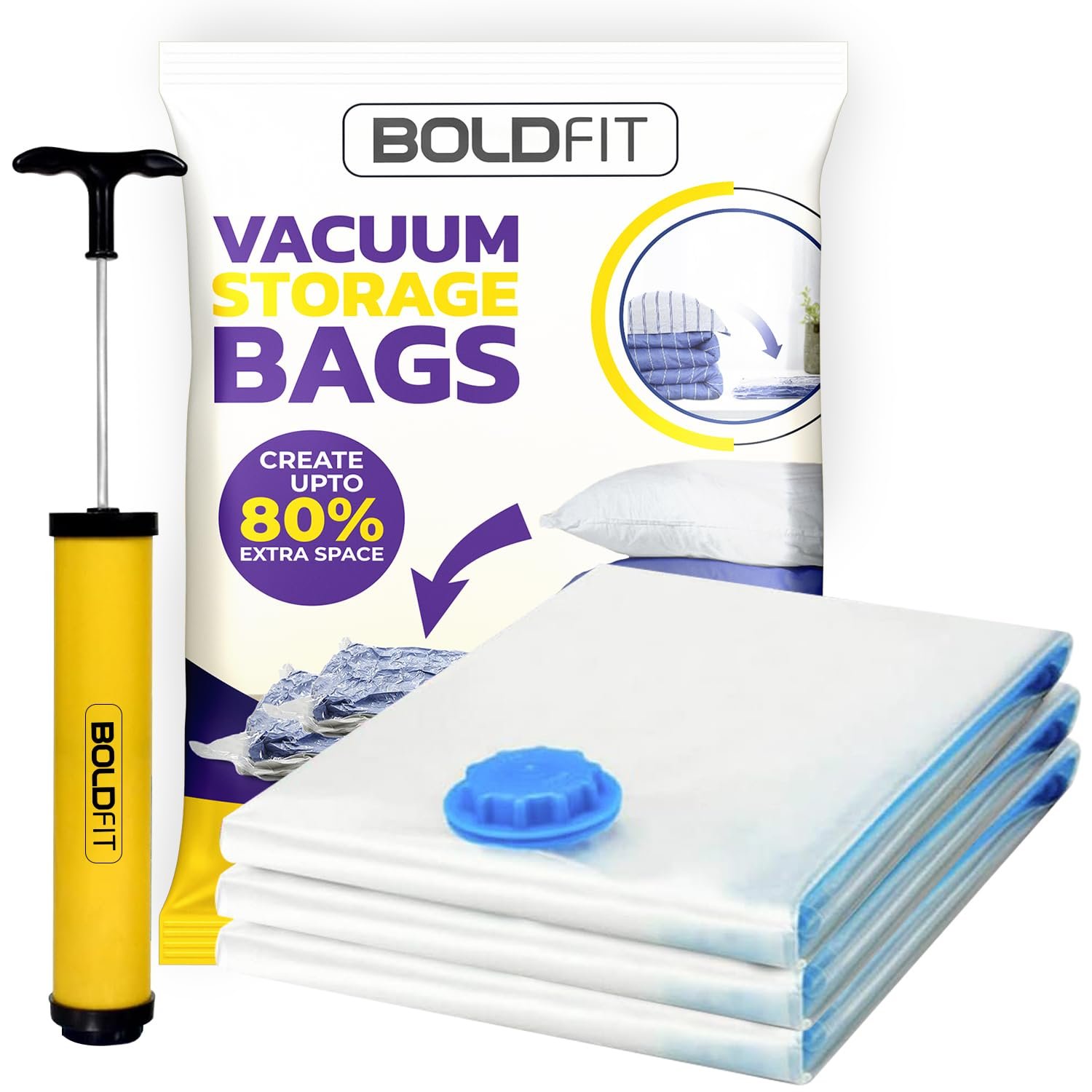Boldfit Plastic Reusable Vacuum Bags For Clothes With Pump For Space Saving Travel Ziplock Bags For Travel Packing Blankets Compression Vacuum Storage Bags,Vacuum Bag,Set Of 3(Small),Transparent