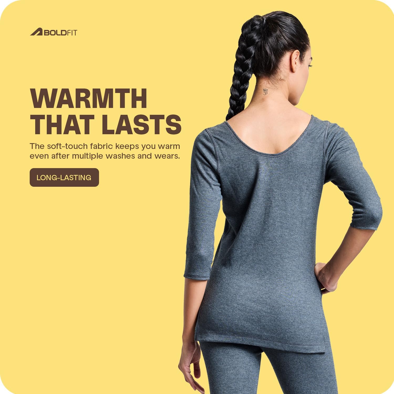 Stay warm and stylish with the Boldfit ThermaCore Thermals for women top, your go-to base layer for cold-weather adventures. This full-sleeve upper thermals for extreme cold weather is made from a premium blend of 60% Cotton, 12% Viscose, and 28% Polyester, offering natural insulation to keep you cozy while ensuring breathability and comfort. The ribbed fabric provides a soft, stretchy fit that moves with your body, while the BOLDTECH moisture management system wicks away sweat to keep you dry. With its anti-microbial properties, the ThermaCore thermals for women winter wear top stays fresh even after long hours of wear. The deep round neck and full sleeves make it easy to layer under jackets, sweaters, or coats, while the stylish design allows it to be worn on its own. Whether you’re heading to the gym, going for a winter hike, or just enjoying a cozy day indoors, the ThermaCore women winter top offers warmth, style, and versatility.