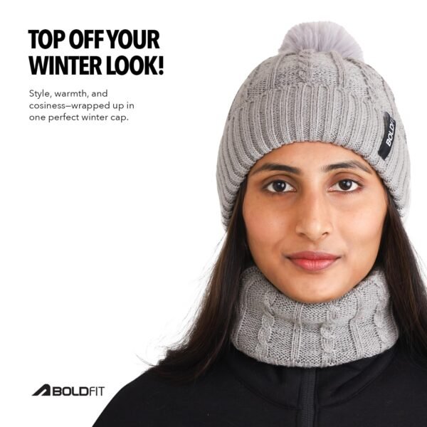 STYLISH AND VERSATILE FOR WINTER FASHION: This capâ€s elegant design, with its classic cable-knit pattern and neutral grey color, makes it a versatile addition to any winter wardrobe. Suitable for outdoor sports, casual wear, or city outings, it combines function and fashion seamlessly. Enjoy the perfect balance of style and warmth with Boldfitâ€s winter cap, a must-have accessory for the colder months.