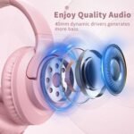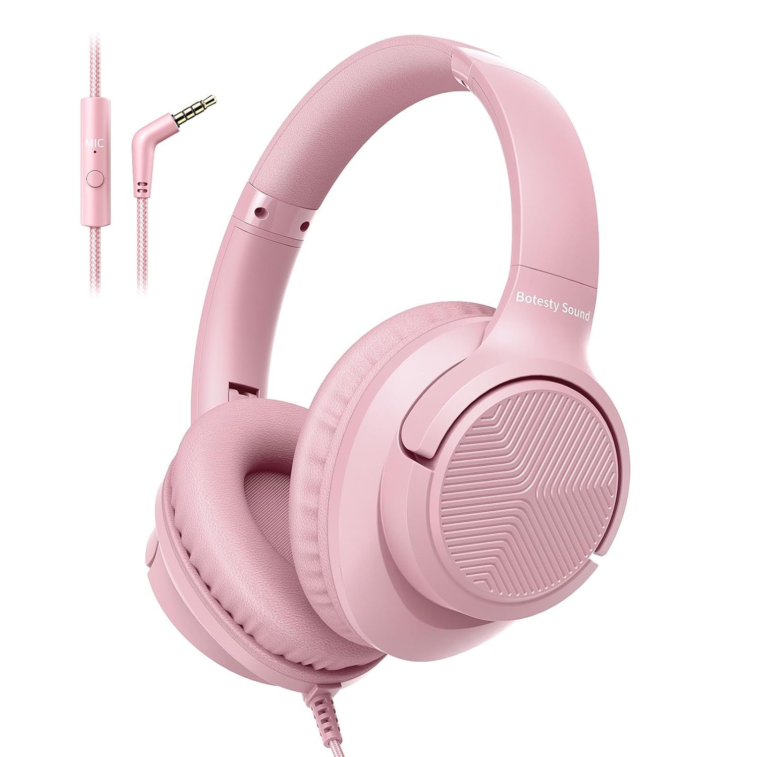 Botesty Sound Iris Over Ear Headphones Wired with Mic, 4.9ft Tangle-Free Nylon Cord, 3.5mm Plug, Pink