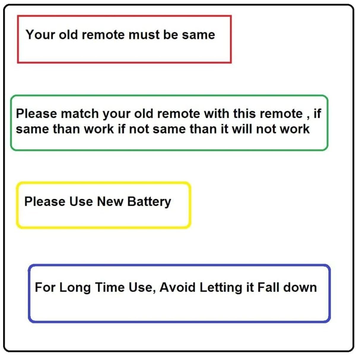 Remote must be Exactly Same (Function to Function) as per your Old/Original Remote.