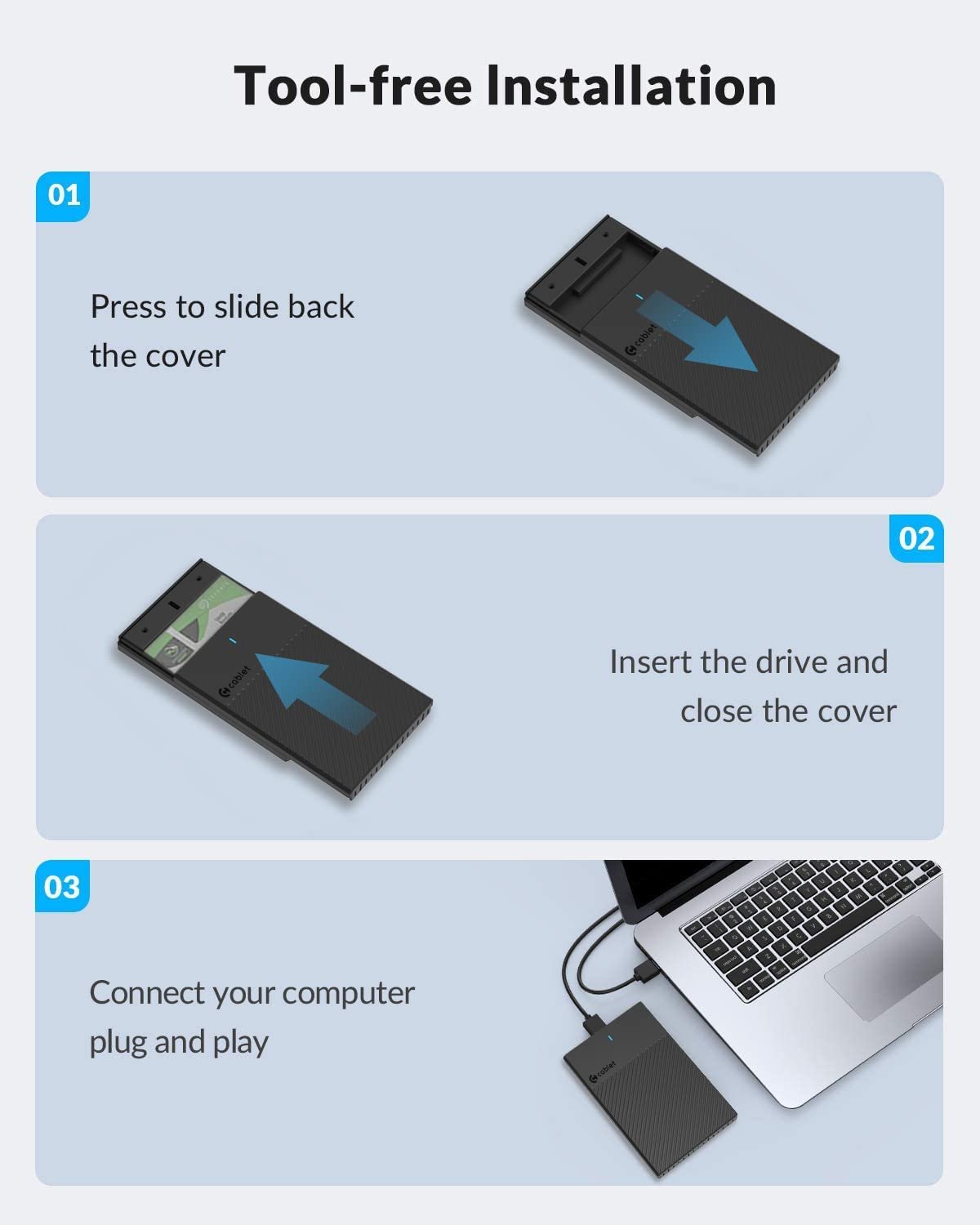 Cablet 2.5 Inch SATA USB 3.0 HDD/SSD Portable External Enclosure for 7mm and 9.5mm, Tool-Free Design, Supports UASP Max 6TB