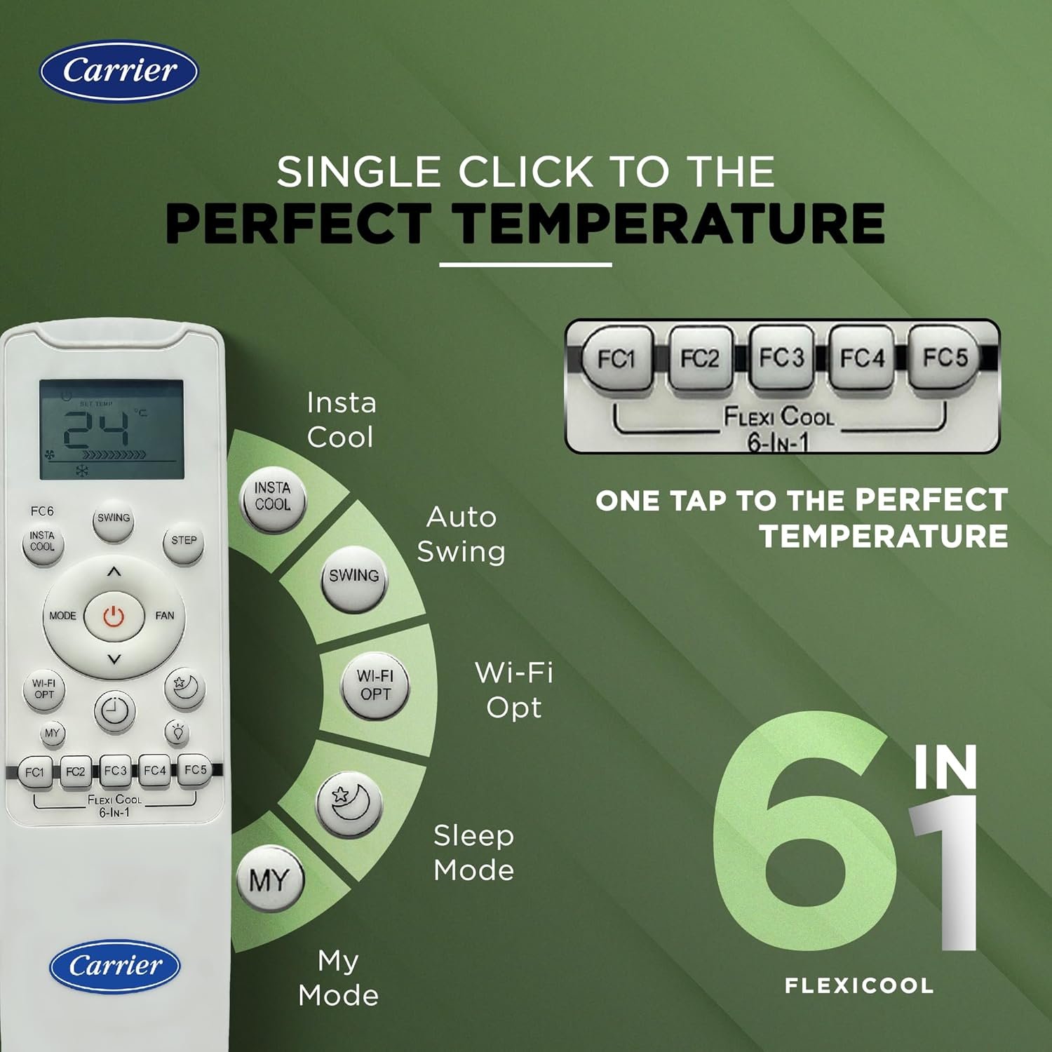 Special Features: 4 Fan Speed; Hi Grooved Copper; Stabilizer Free Operation within 135~280 V range; Hidden Display;Dry; Auto ; Follow Me Function; Auto On/Off Timer; Sleep mode; Auto Restart; Intelligent CRF Alert