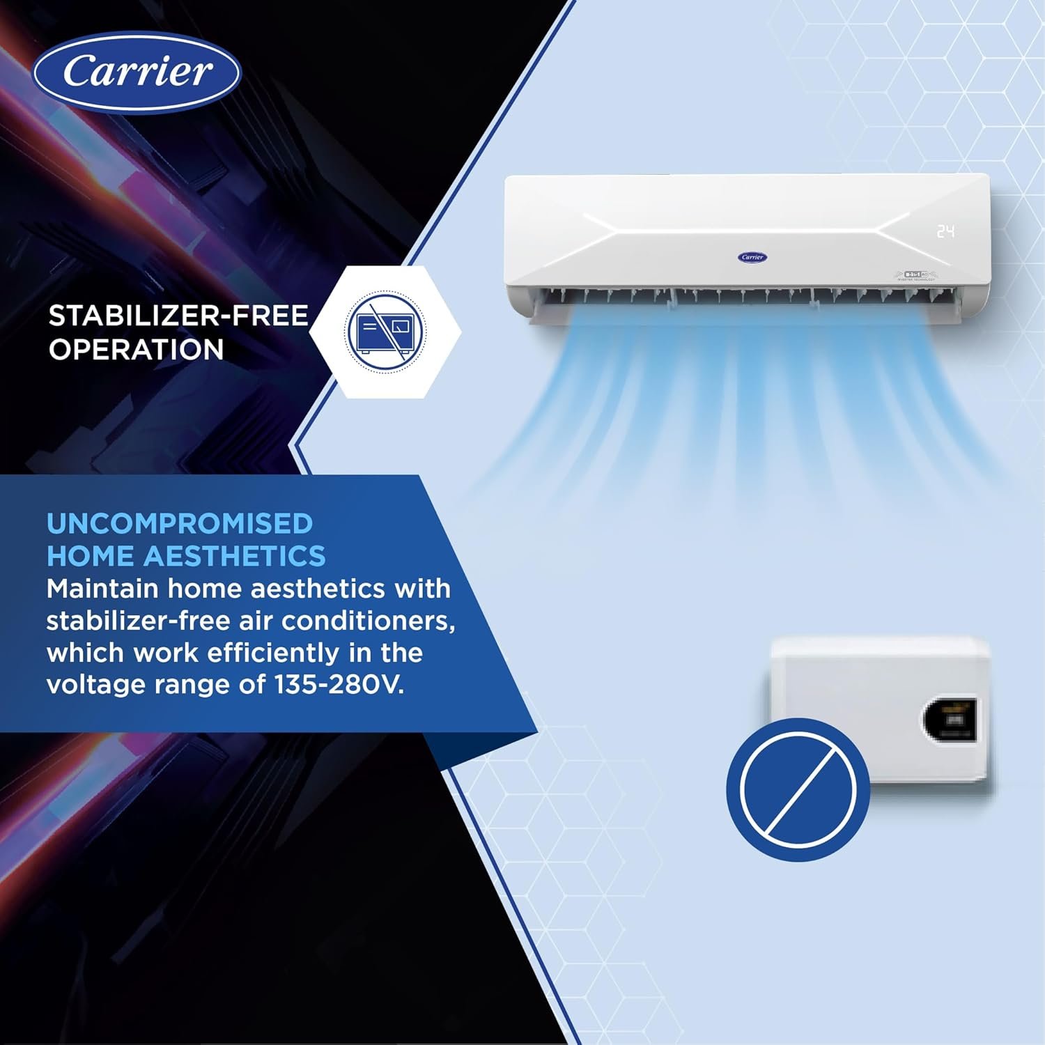 Say goodbye to stabilizers, say hello to Carrier’s stabilizer-free ACs. They operate efficiently within a wide voltage range (135-280V), eliminating the need for an external stabilizer. Enjoy aesthetics without compromising on performance.