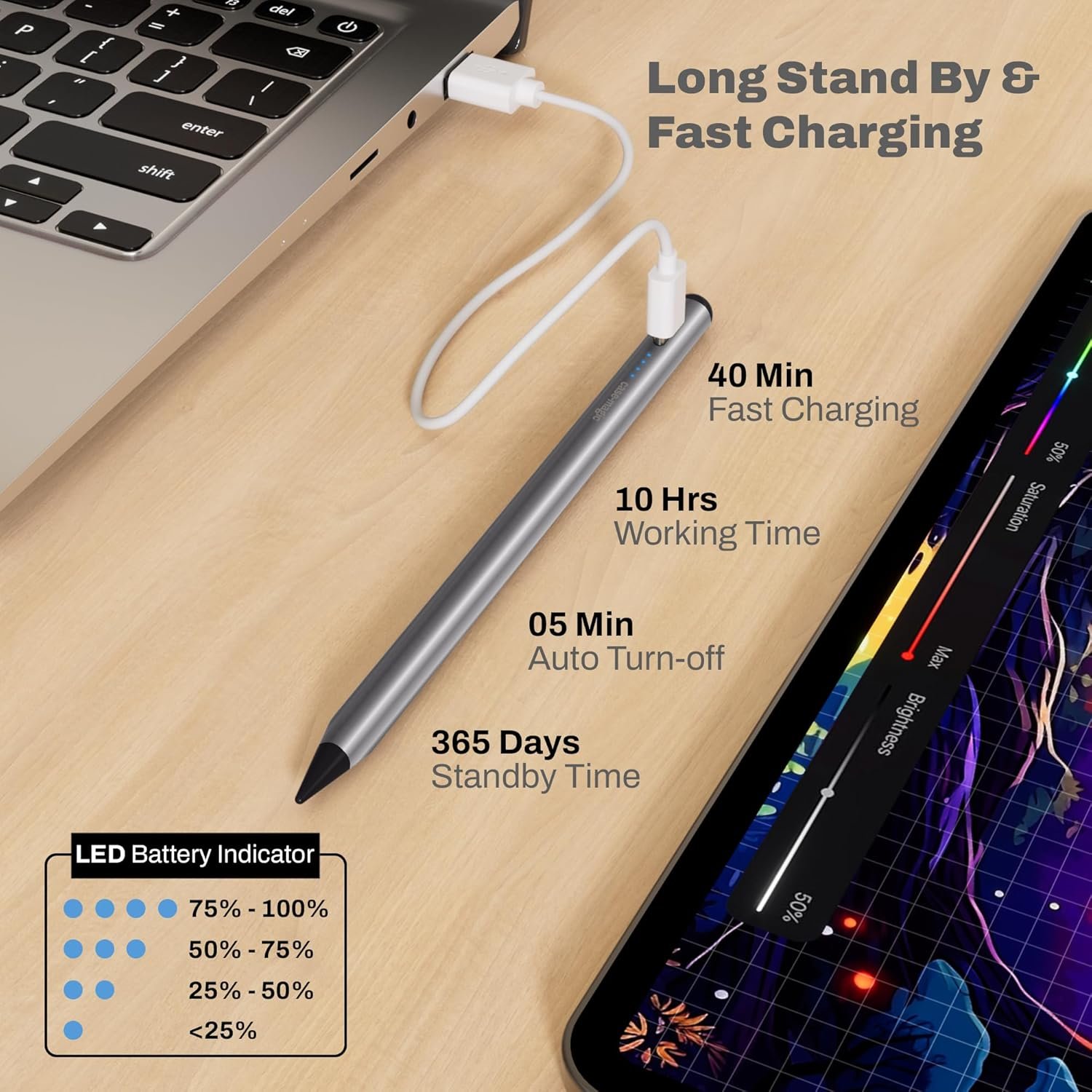 Fast Charging: With Type-C Quick Charging That Powers Up In Just 40 Minutes And A Long Battery Life Providing Up To 10 Hours Of Continuous Use, This Stylus Ensures Uninterrupted Creativity.