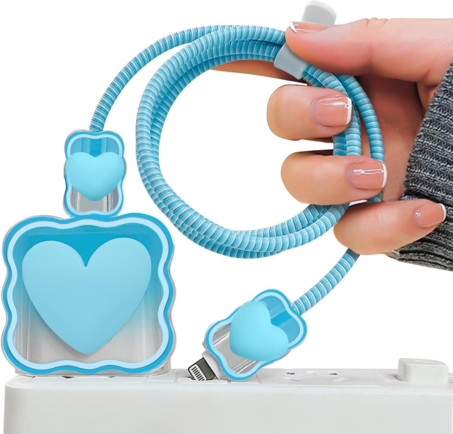 CASENED Case for Apple 20W iPhone USB-C Power Adapter Charger and USB Lightning Cable Protector | 3D Heart Design Soft Phone Charging Protective Cover (Blue Heart)
