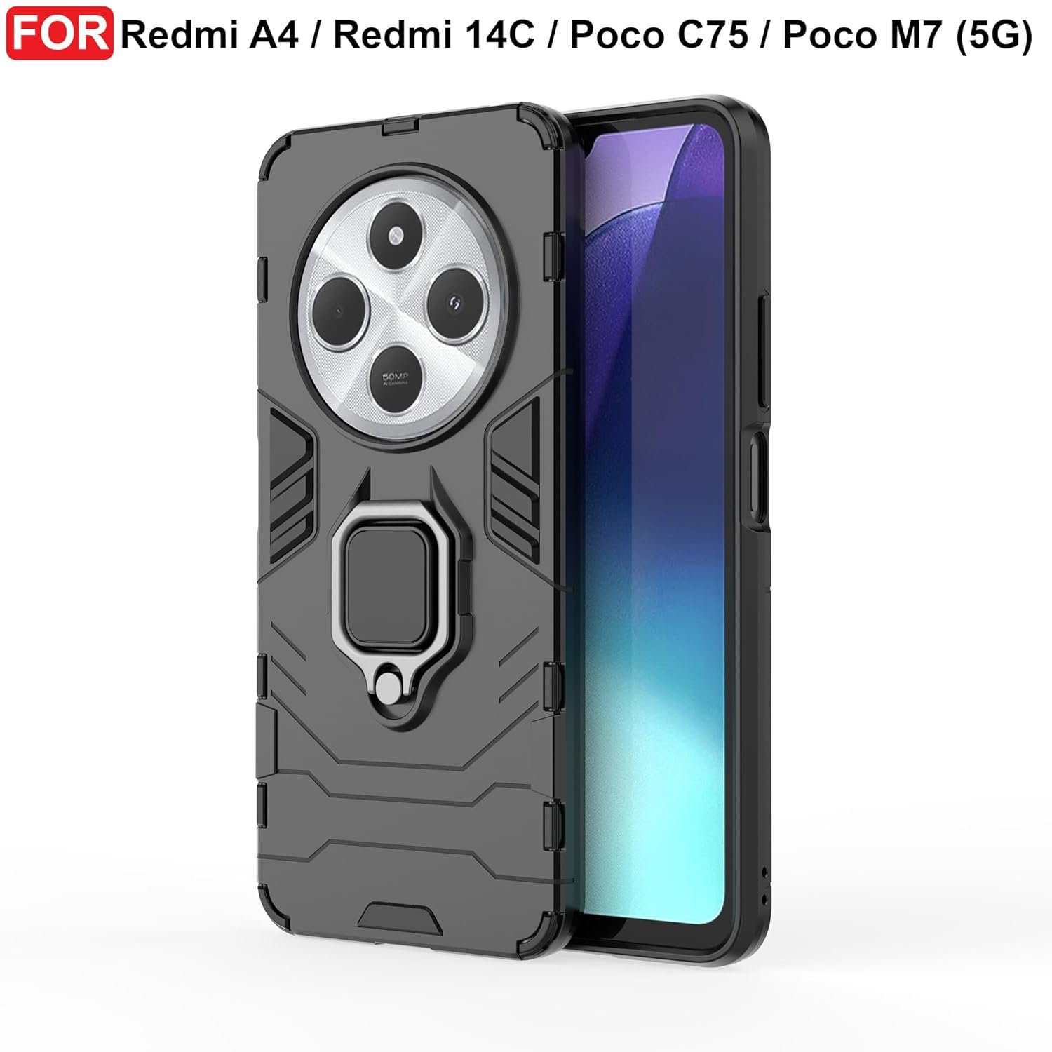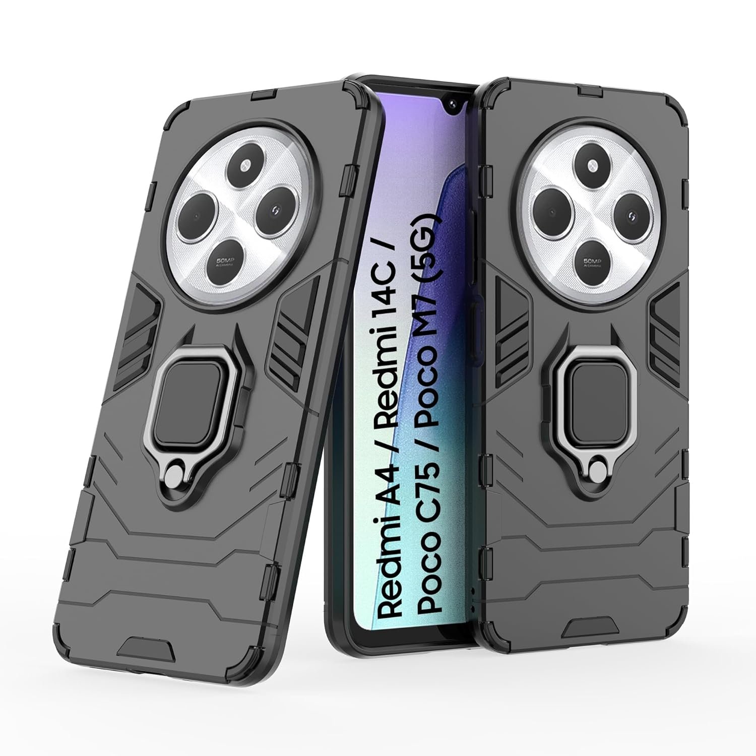 CEDO Rugged Redmi 14C (4G)/ Redmi 14C (5G)/ Redmi A4/ Poco C75/ Poco M7 (5G) Kickstand Case | Built-in Stand Rotating Ring Holder | Military Grade Armor Bumper Back Cover (Black)